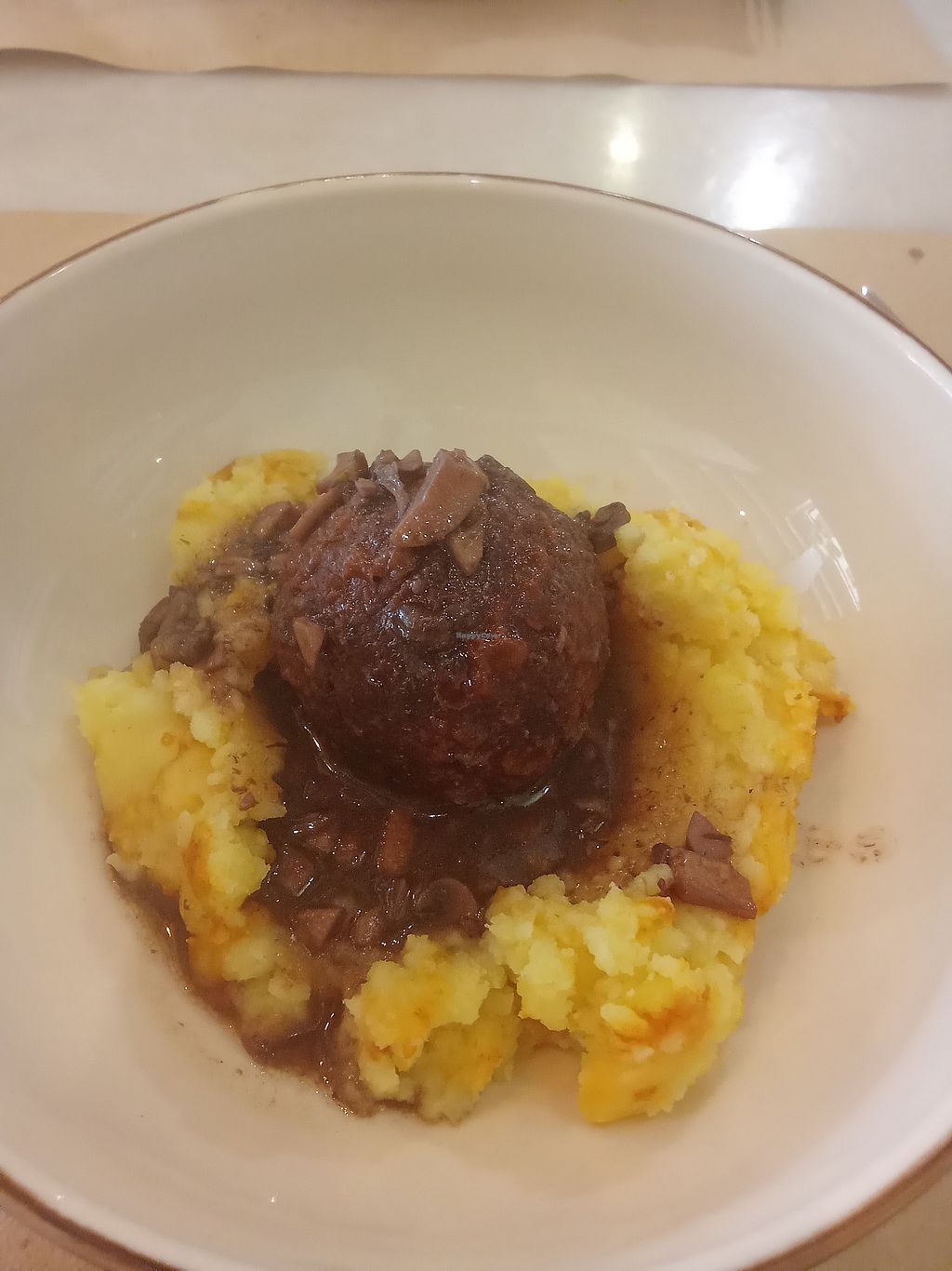 Comimos las croquetas, absolutamente deliciosas. Yo me pedí una albóndiga con puré de patatas, y mi acompañante no vegano una hamburguesa crispi. Todo genial y la atención súper buena ☺️