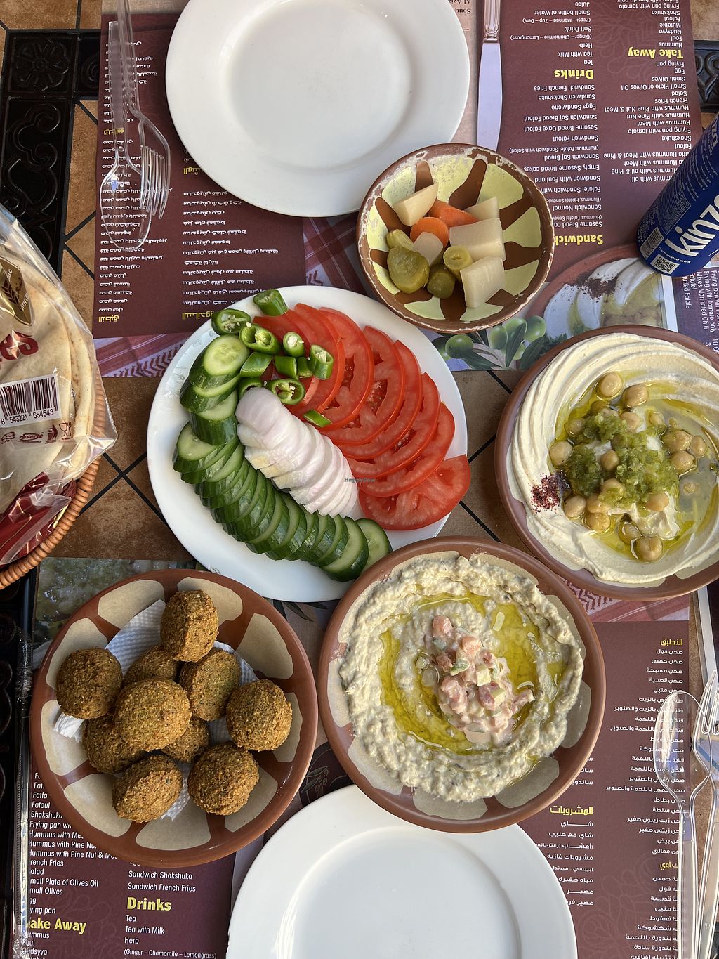 Serves meat, vegan options available. Owner is from Jordan. Could get hummus and falafel sandwich with salad as well as foul and falafel with salad. Or order individual dishes to share - each comes with pita and salad.