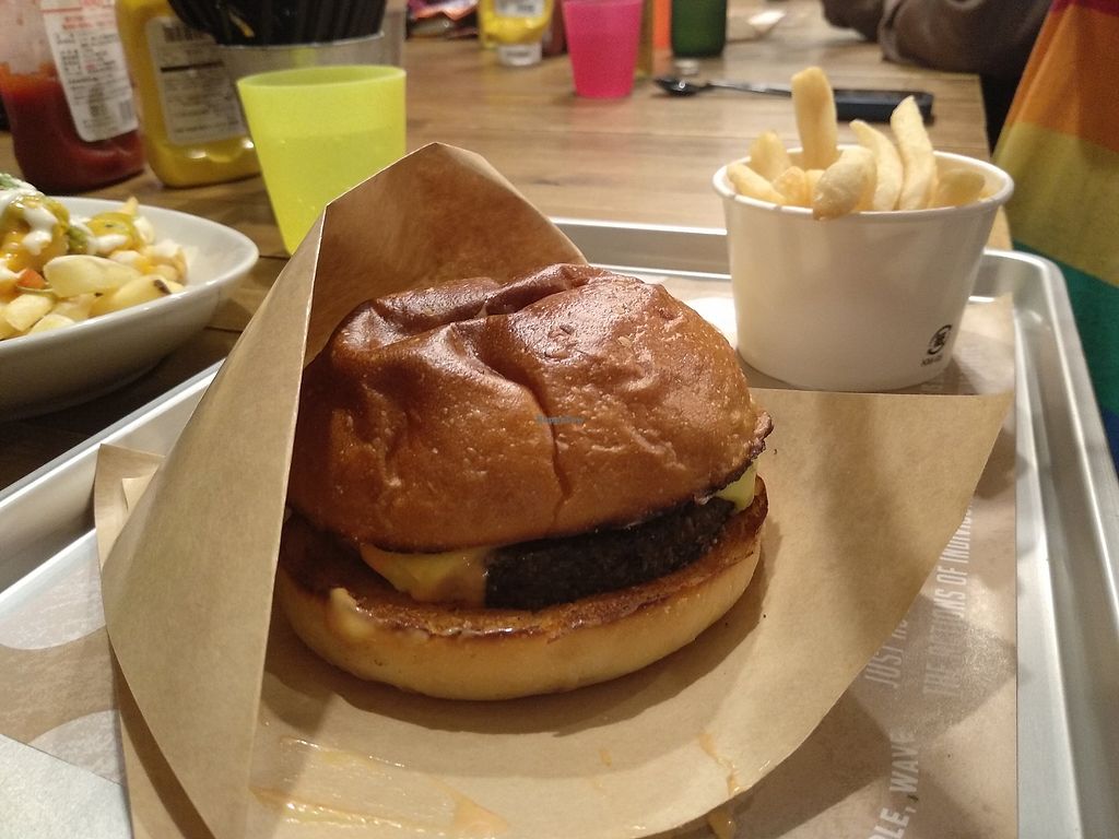 Crispy chicken burger, mac n cheese, and coffee (can ask for soy milk)…