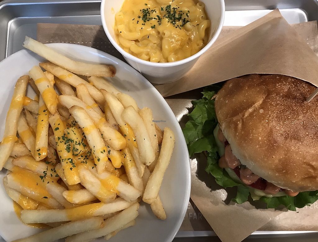 Falafel burger and Mac n cheeze