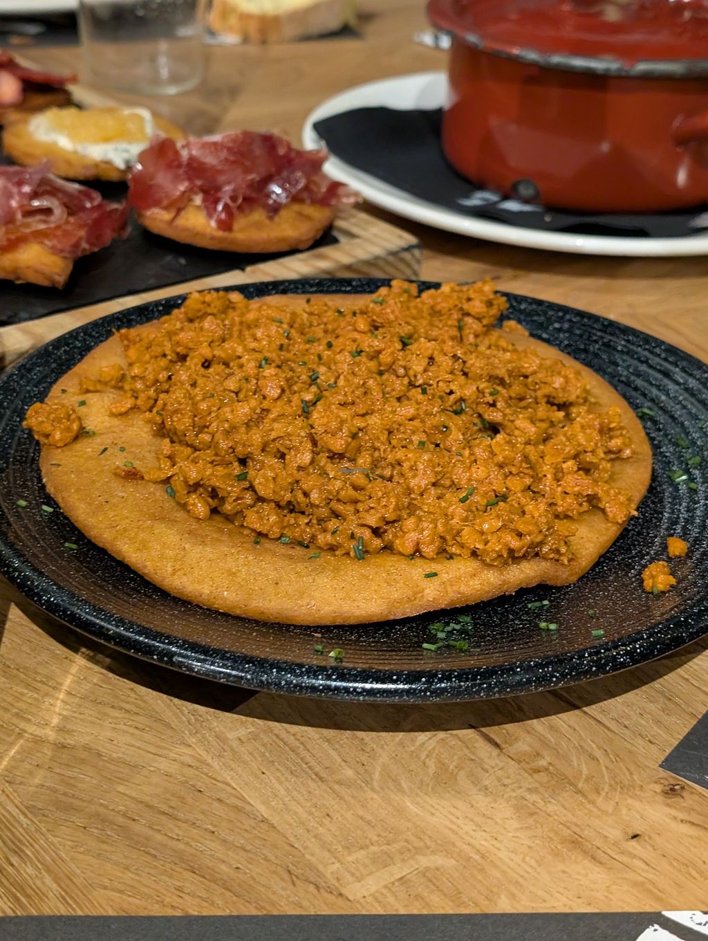 If you want to try some vegan Asturian food or have to dinner with omnis, then this is your place. They offer vegan tortos (corn cakes) with vegan picadillo (soy meat) and vegan cachopo with vegan cheese. The cheese is not labelled as vegan specifically but it definitively is a vegan cheese. The cachopo was a bit dry, but nevertheless this is a great option to go.
