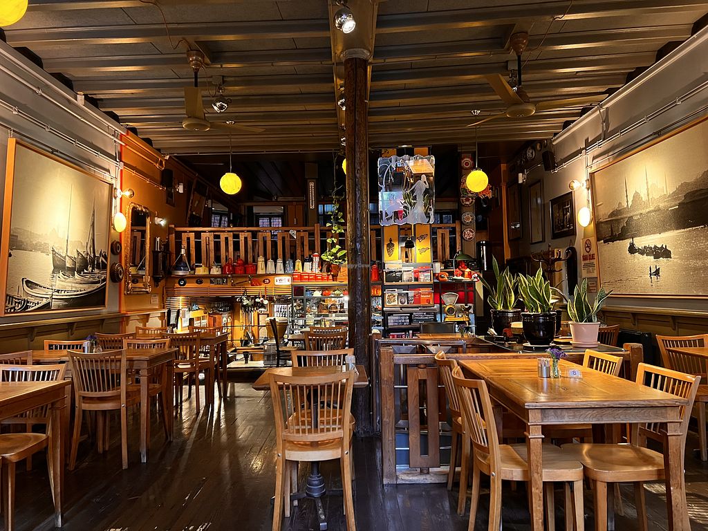 Serves meat, vegan options available. International restaurant offering breakfast with vegan options, including vegan cheese, plant milks, soy mince, and vegan sausage. NOTE: Reported September 2024 to have limited vegan options – please send updates to HappyCow. Open Mon-Fri 9:00am-11:30pm, Sat-Sun 10:00am-11:30pm.