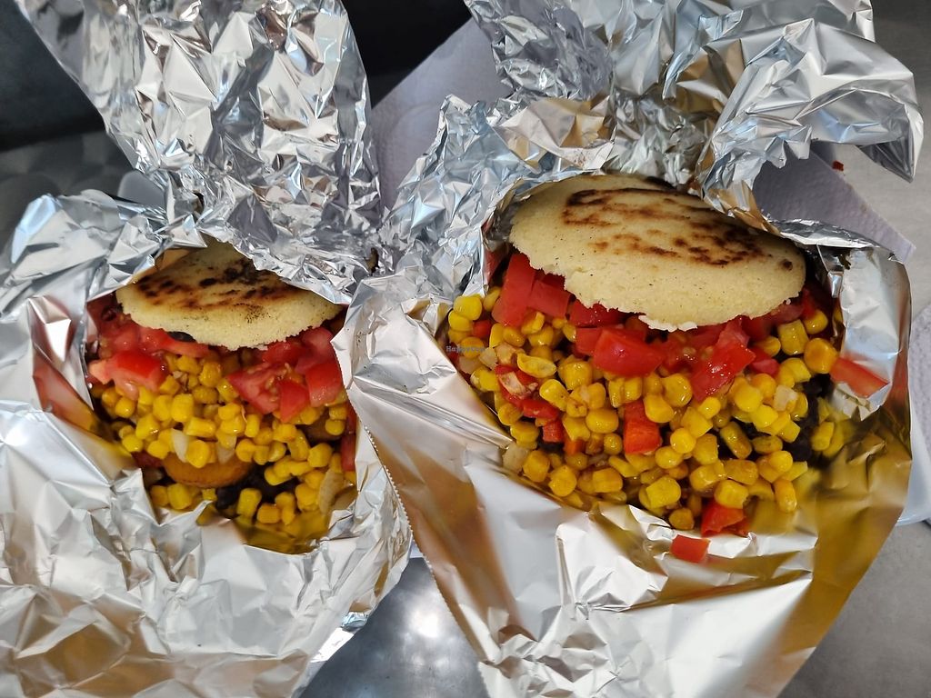 Delicious arepa with corn and beans, tomatoes and onion, made fresh, with a friendly service. Would recommend.