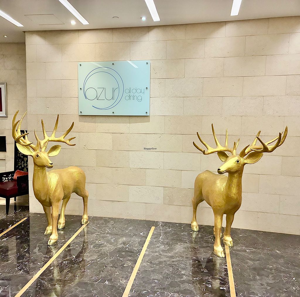 Serves meat, vegan options available. Breakfast and lunch buffet restaurant located within the Raffles Dubai hotel, open to the public. The venue serves international cuisine with clearly identified vegan options on both the buffet and menu. Choices include quinoa and oat porridge, avocado toast, and wholemeal fruit bread. Indian dishes such as aloo paratha, masala dosa, uttapam, and sambar are available. Other offerings include ful medames, falafel, baked beans, hash browns, fresh cut fruit, and a salad bar. Open Mon-Fri 7:00am-10:30am, Sat-Sun 7:00am-11:00am.