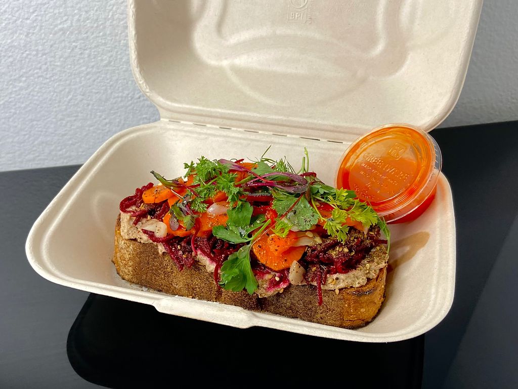 I love their veggie toast with fermented carrots! Can bring in coffee from Analog.