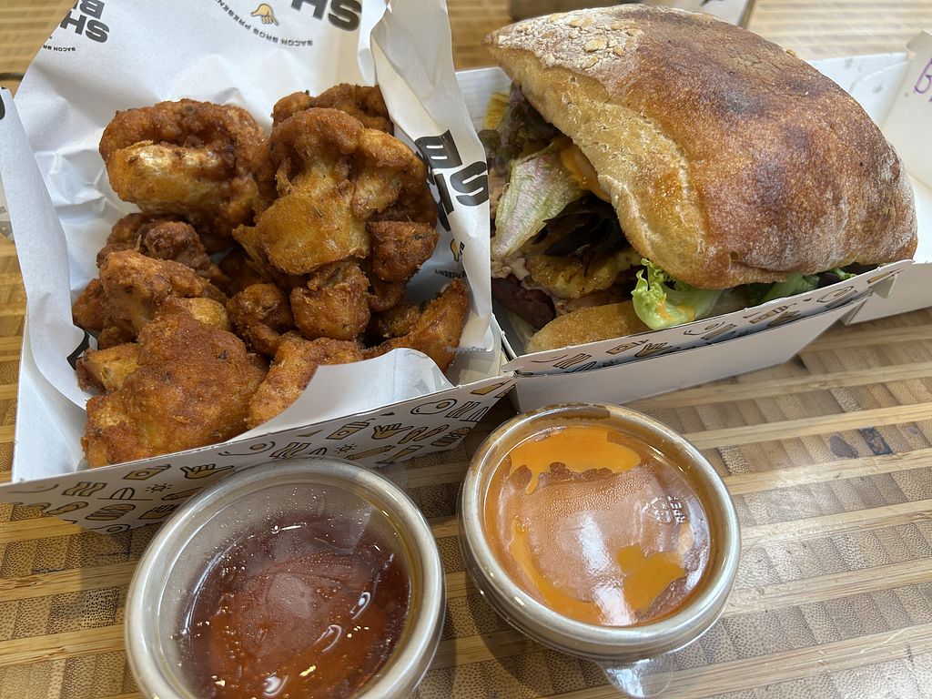 They had 4 vegan burger options which was great but a couple of them are quite weird flavours/combos. I had the chicken burger which was alright but not amazing, and the coco bacon was a miss for me, very coconutty and i felt it didn't fit at all with the burger flavour (also in small pieces so warning if you don't like it it's hard to remove). The chips are really good however, and their Shaka sauce is vegan and very yum.