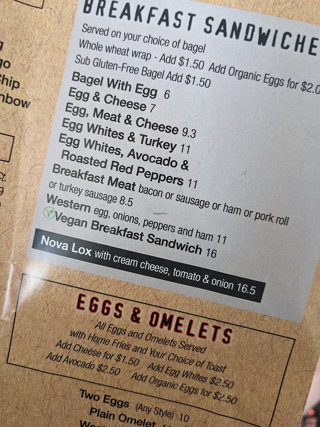 There is a vegan breakfast sandwich on the menu but when I went here (June 2023) I asked which bagels were vegan to see which were options to order for the sandwich and was told that none of the bagels are vegan. I ended up ordering the vegan bowl instead. Very greasy, mostly potato. It was okay but not great and the fact that a vegan breakfast sandwich is listed but none of the bagels (used for making it) are vegan is truly confusing.