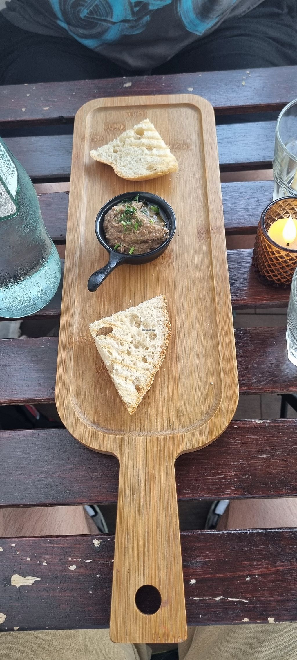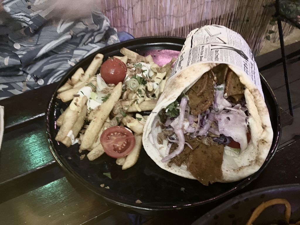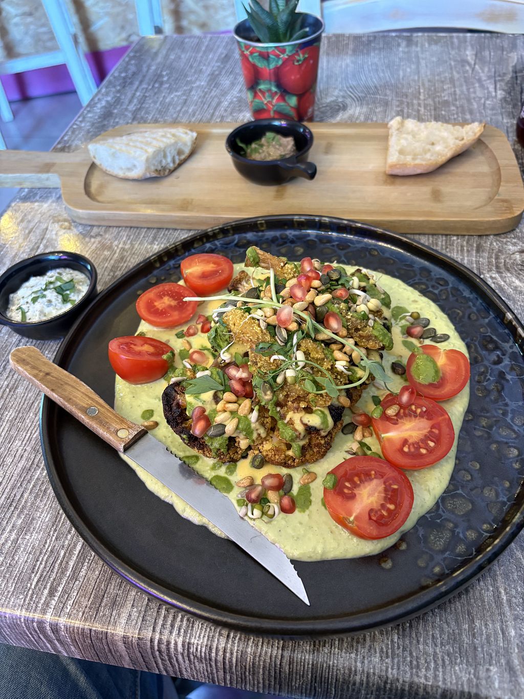 Great vegan food with creative touch and attention to detail. We were served a sample platter of black and white bean pâté with bread which was lovely. I had a soya milk raspberry chai, cold and a traditional vegan ftira made with no-tuna and delicious side salads and garlic vegan-mayo. So good...