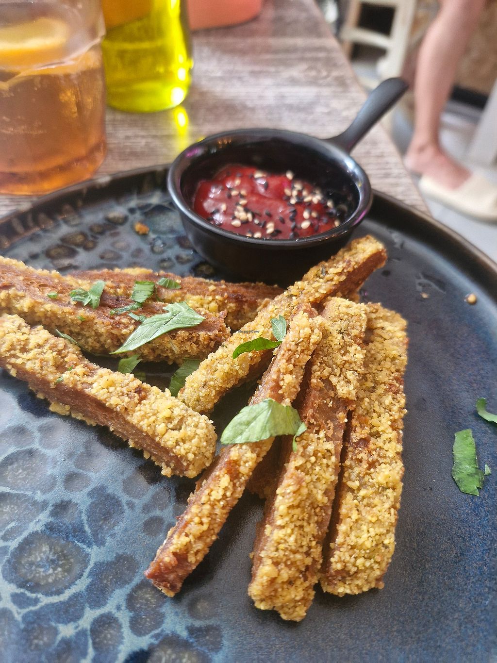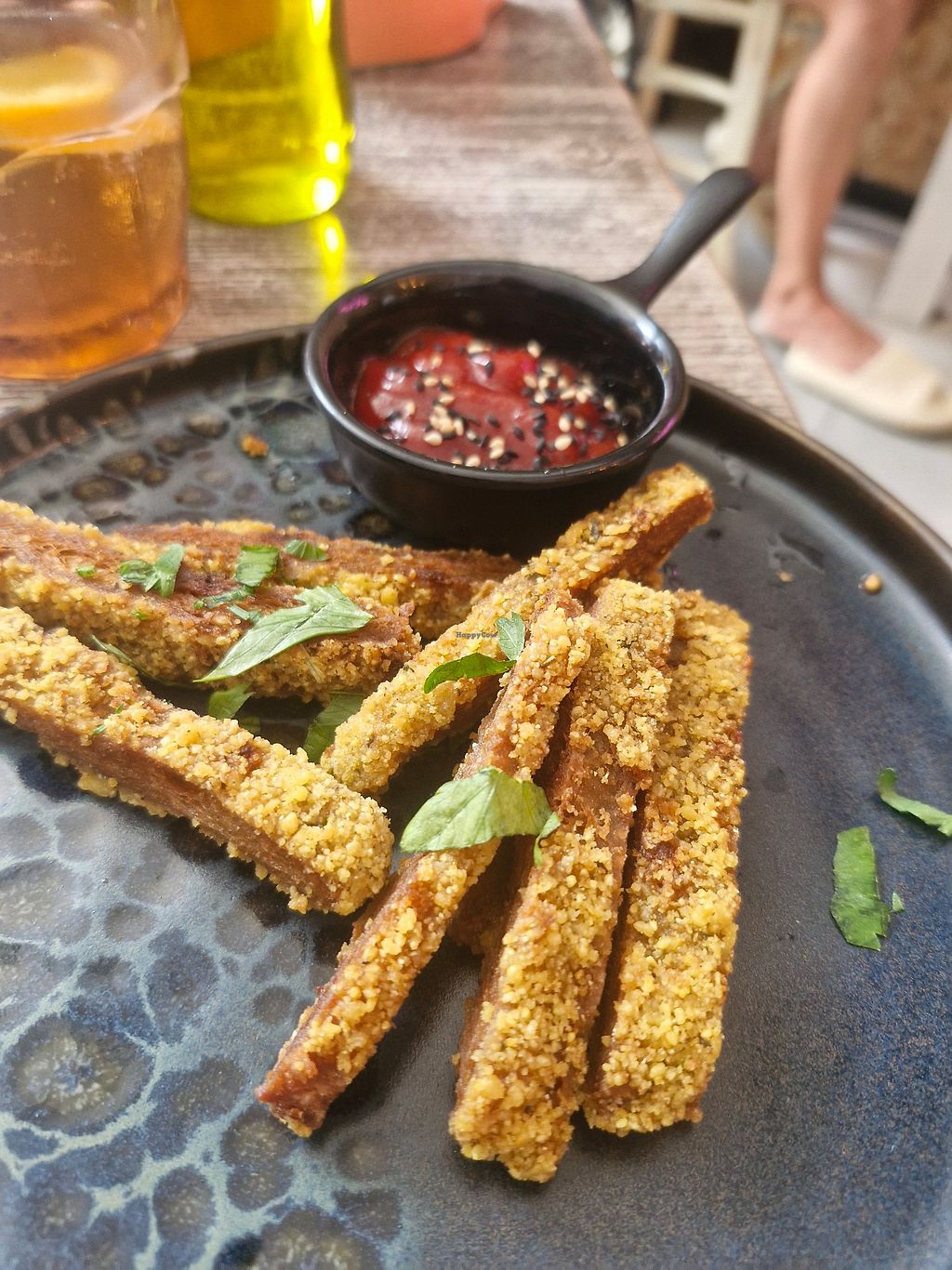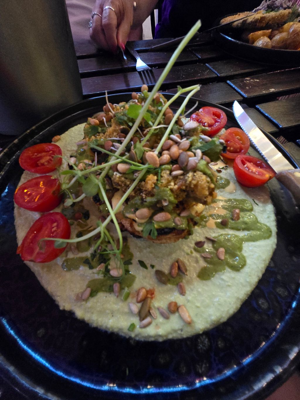 Great vegan food with creative touch and attention to detail. We were served a sample platter of black and white bean pâté with bread which was lovely. I had a soya milk raspberry chai, cold and a traditional vegan ftira made with no-tuna and delicious side salads and garlic vegan-mayo. So good...