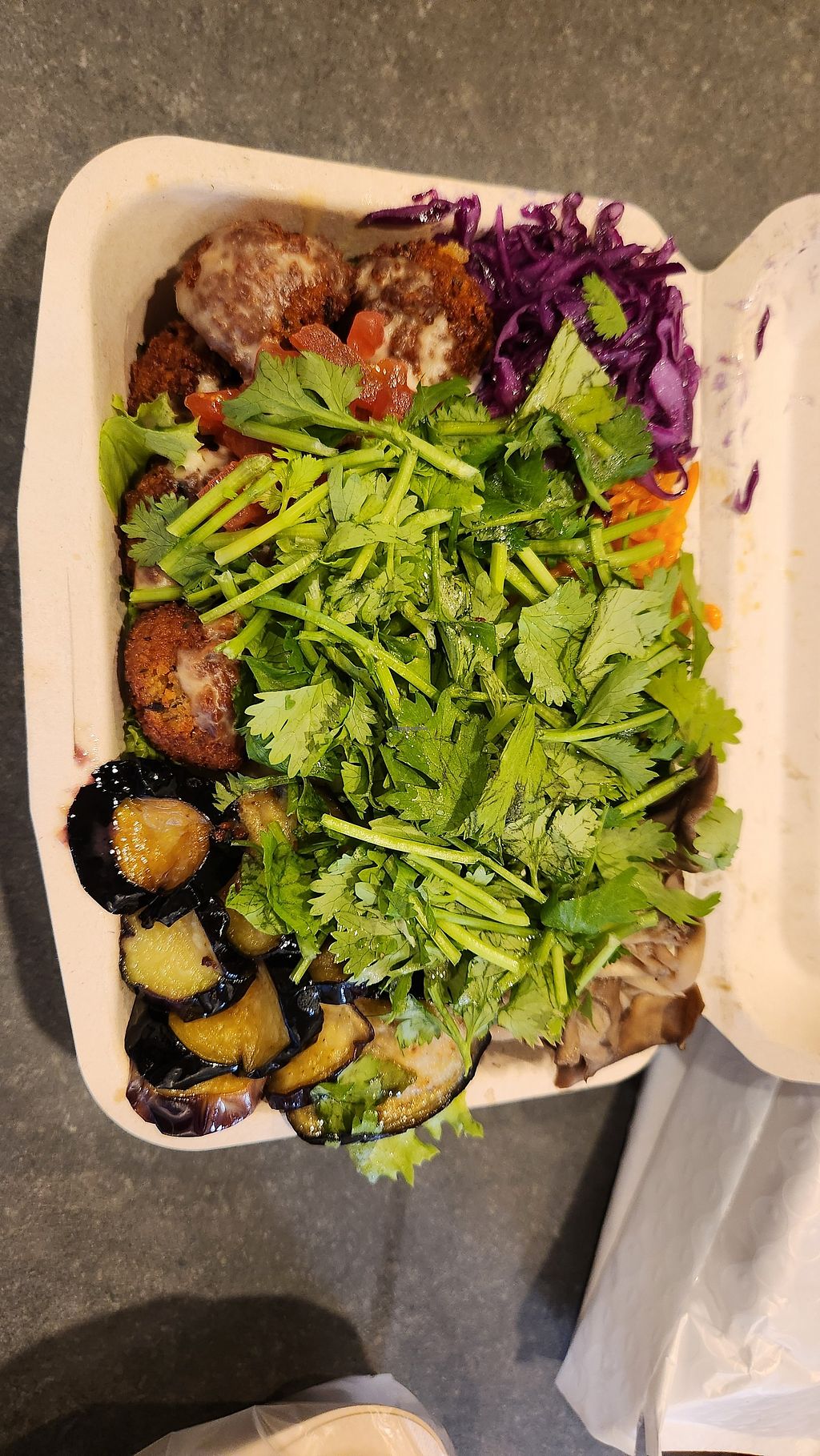 I had the falafel salad, regular size. The plate included falafel (a little oily but quite tasty), fried eggplant slices (way too oily), shredded purple cabbage and carrots were okay, grilled? mushrooms (tasteless), all of this on top of salad with a little bit of sauce. The ingredients flavor didn’t blend in my opinion and some of them were straight out tasteless. Also, the salad had not been washed all that well since it had some dirt on it...