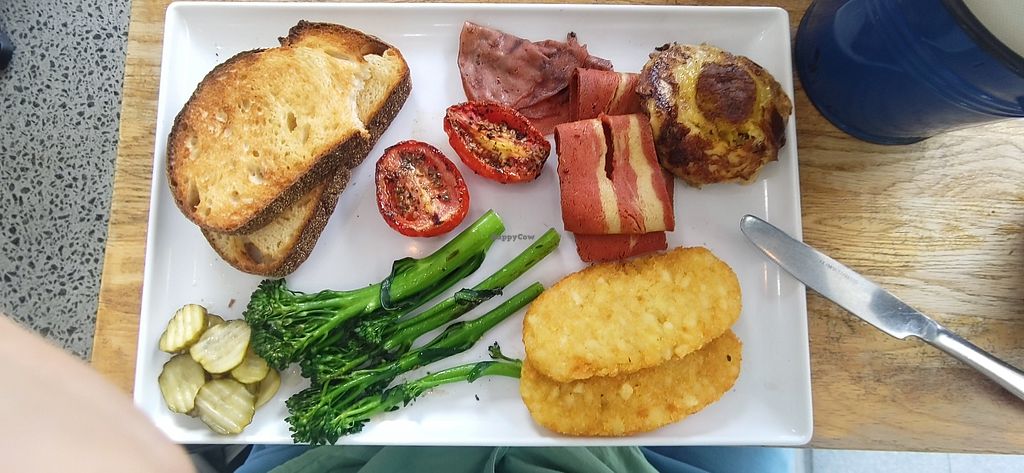 Vegan (or any dietary) options are not marked on the menu available in the restaurant. The member of staff I spoke to didn't inspire confidence that they knew what could be made vegan, but they did get it right. I had a big breakfast, which for $4 extra ($32) subs vegan eggs, vegan bacon and vegan ham (instead of chorizo). The vegan eggs seem(?) to be home made and were very flavourful, I was impressed. The problem is the rest of the breakfast was exceptionally dry, the items in it aren't the juiciest things and the sourdough toast had no spread for it. They need to add baked beans, vegan spread, juicy mushrooms or extra tomatoes or something to help. My partner had a meat meal and said it was "ok".