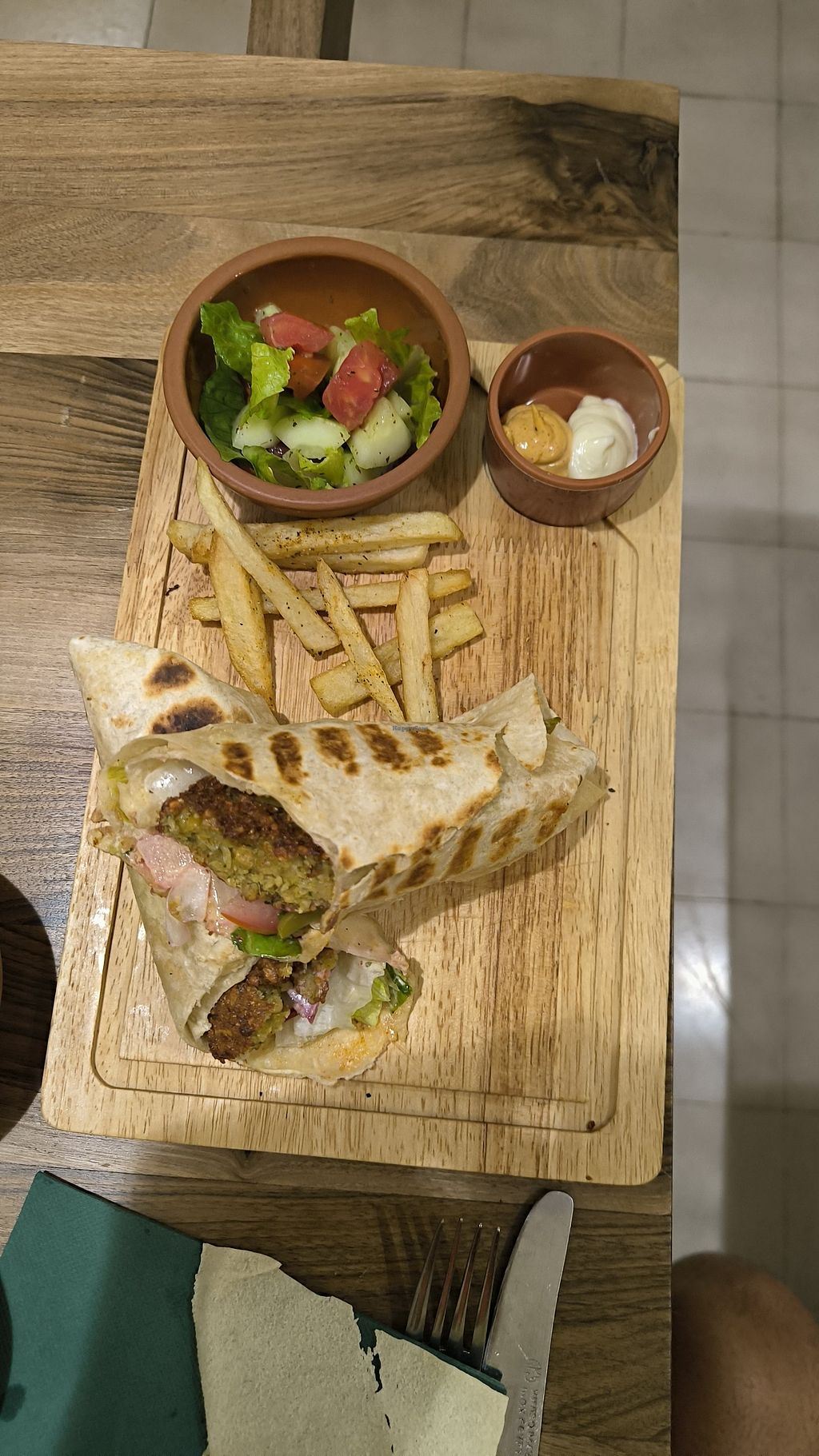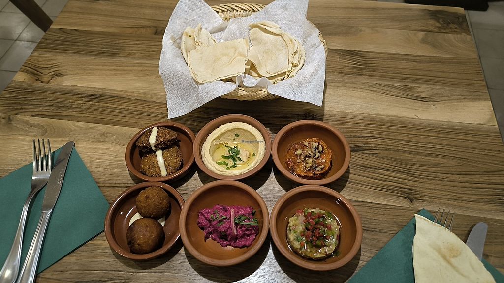 Pedimos falafel y mezzes veg (recordar sin salsa de yogurt, por si acaso) y bastante rico. El falafel un pelo seco pero sabroso y los mezzes destacando la muhamara y el kibeh (una especie de croqueta rellena muy sabrosa). Como muchos libaneses, no fallan.