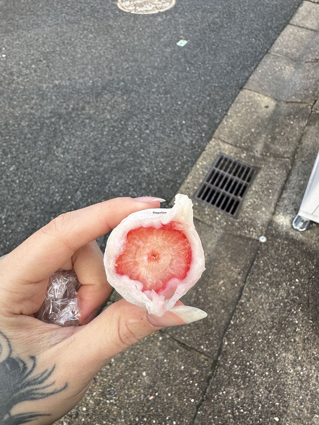 Clearly labelled vegan mochi with fresh fruit inside, instead of a paste or ice cream. The fruit is perfectly ripe and gives a very different experience. They also have other flavours. Definitely worth a try, even if a bit on the pricey side.