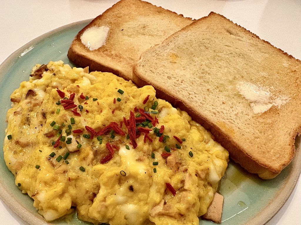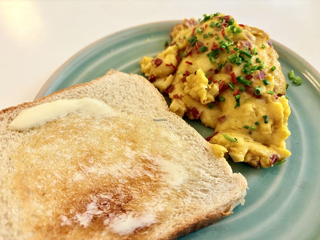 Pros: Fully vegan, Good vegan "scrambled eggs"