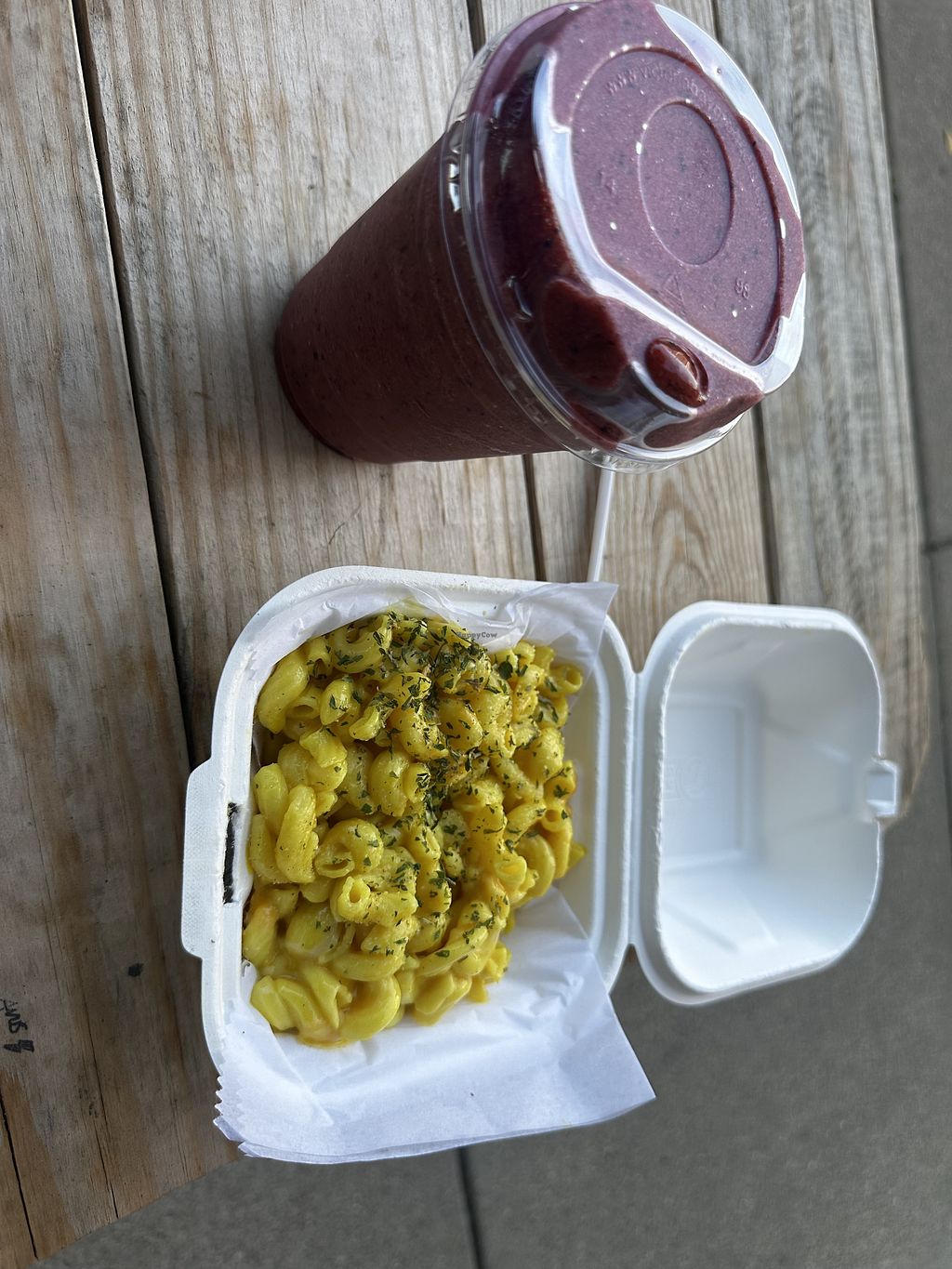 About 20 min from Indianapolis international , had jerked jackfruit maple sauce and mac cheese n smoothie , jack fruit was cooked without sauce and then added sauce different but yummmie we asked no jalepena they still added it Mac cheese was melty and very good , felt like working staff didn’t really know much about food today where as at the fairgrounds we felt the staff was very much vegan. , deliscious average price and worth the trip non the less