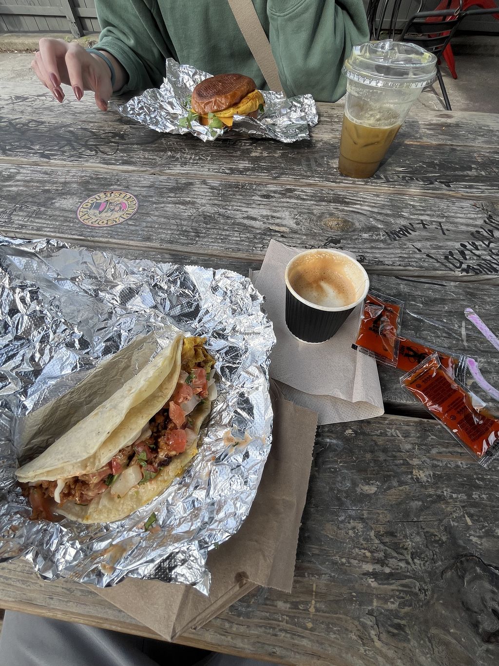 We got a ton of stuff to share: both Warpig and Flying Tacos, the Flying Burrito and LEGGacy of Brutality sandwich. All of it was great, super filling, classic breakfast food. Ordering and pick up was easy. Coffee, chai and cold brew were great as well. Look forward to coming back and being able to sit on the patio!