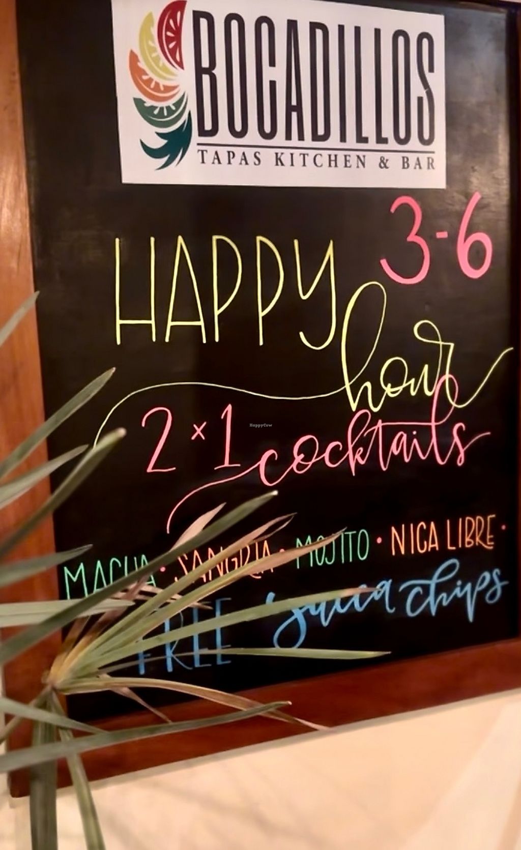 Serves meat, vegan options available. Tapas bar serving small and medium plates. Vegan options include yucca chips, hummus, bruschetta, avocado salad, Thai noodle salad, and more. Some vegetarian tapas can be made vegan by omitting cheese. Open Mon-Sun 3:00pm-9:00pm. Closed Sun and Mon.