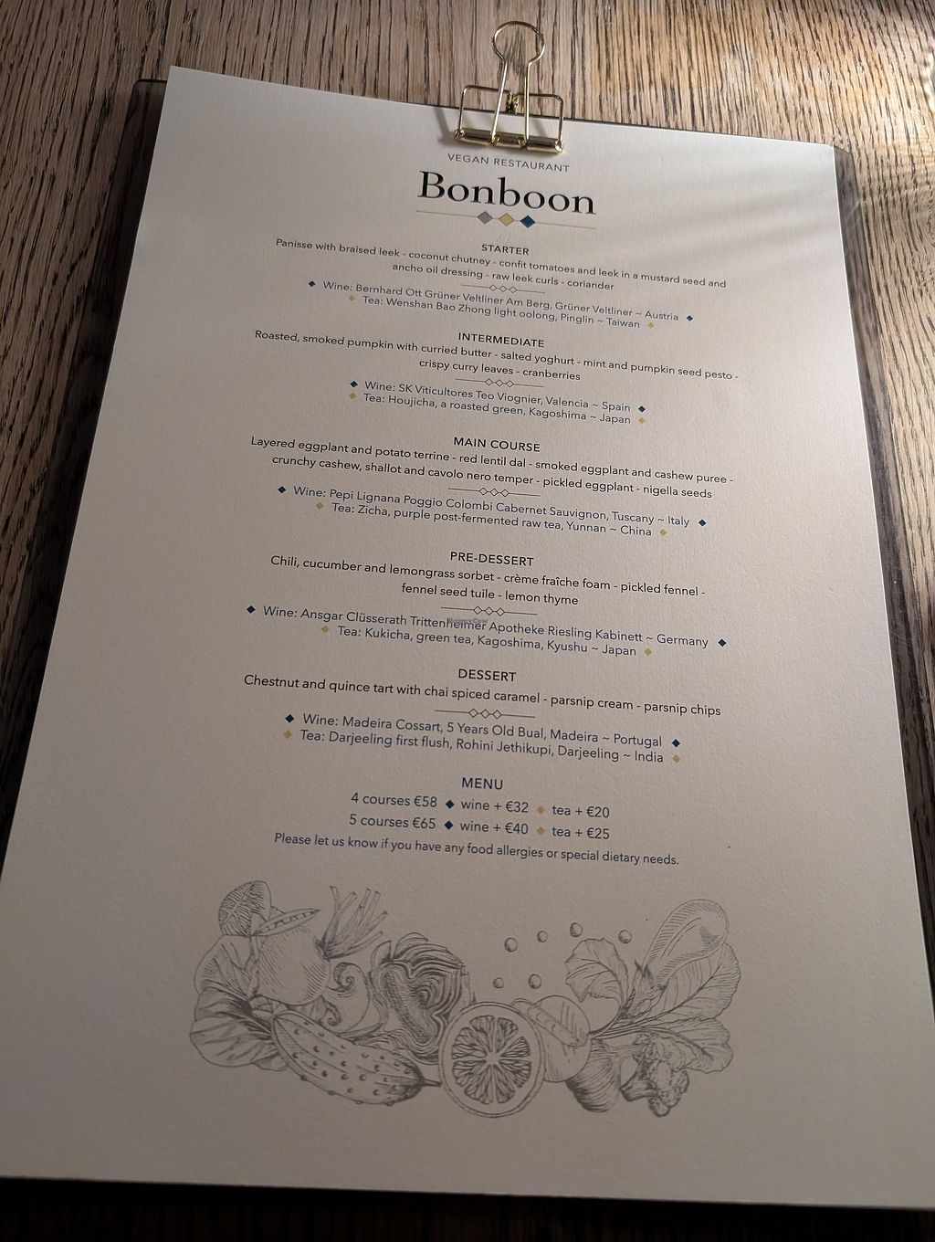 Vegan fine dining with a set 4 or 5 course menu, which you can pair with wine or tea or just pick your own drink.