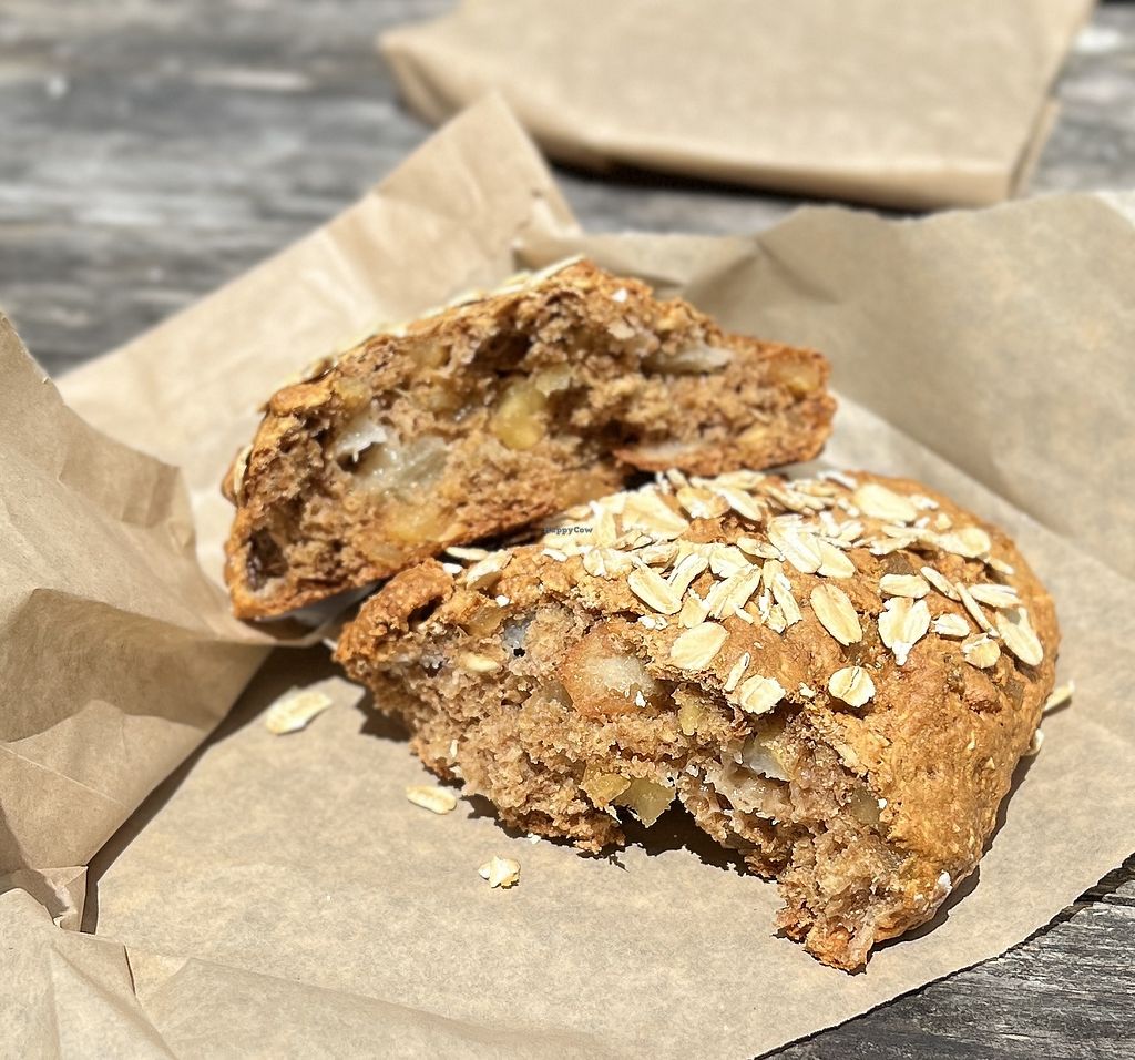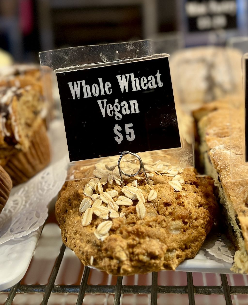 Small bakery with vegan items including daily whole wheat scone with fruit or nuts and vegan cookie-oat almond maple. Offers coffee cake over the weekend. Plant-based milk alternatives available. Open Mon-Fri 6:30am-4:00pm, Sat-Sun 7:00am-4:00pm.