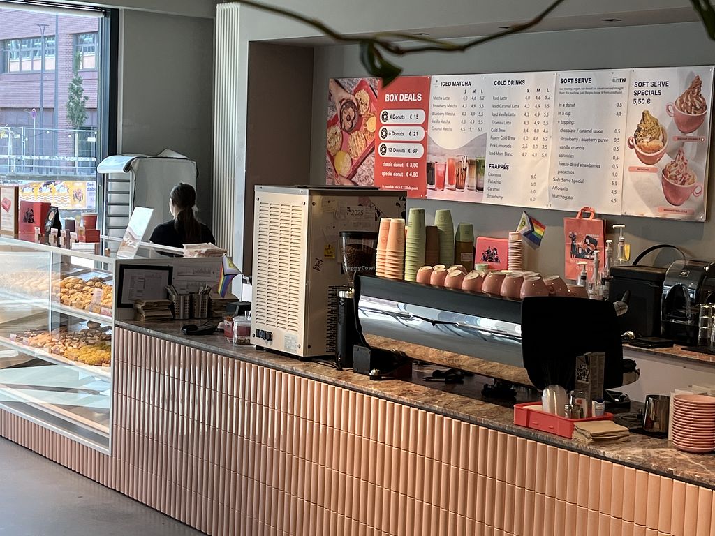 Fully vegan bakery specializing in donuts. Features a daily assortment of freshly made donuts as well as coffee-based drinks. Offers Oatly vegan soft serve, in a donut or on its own with various toppings. Cashless. Open Mon-Thu 11:00-20:00, Fri-Sat 11:00-21:00, Sun 11:00-19:00.