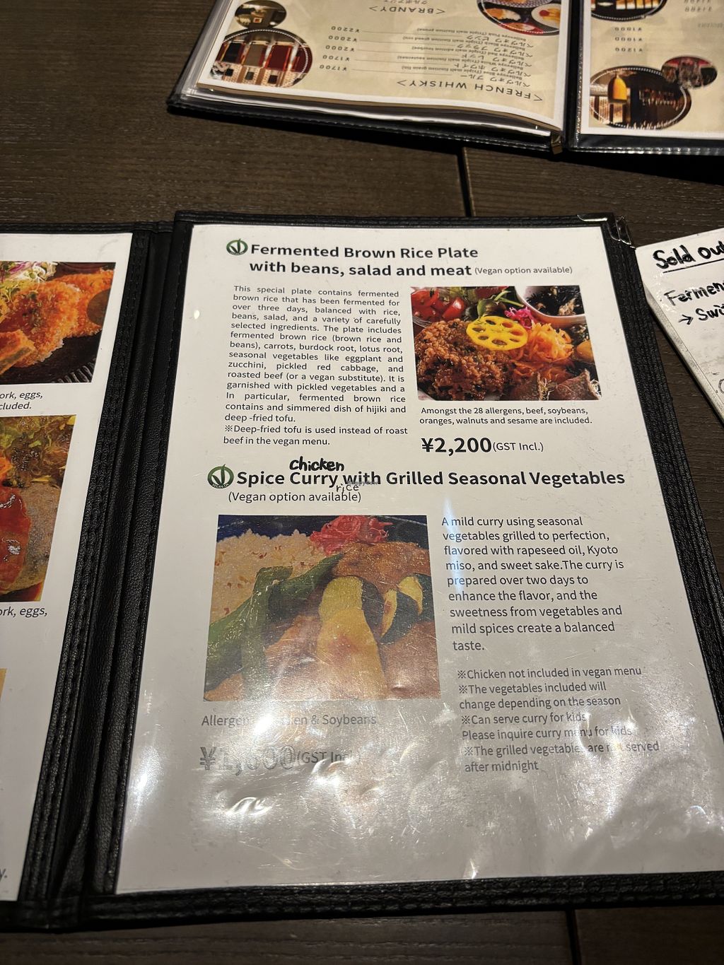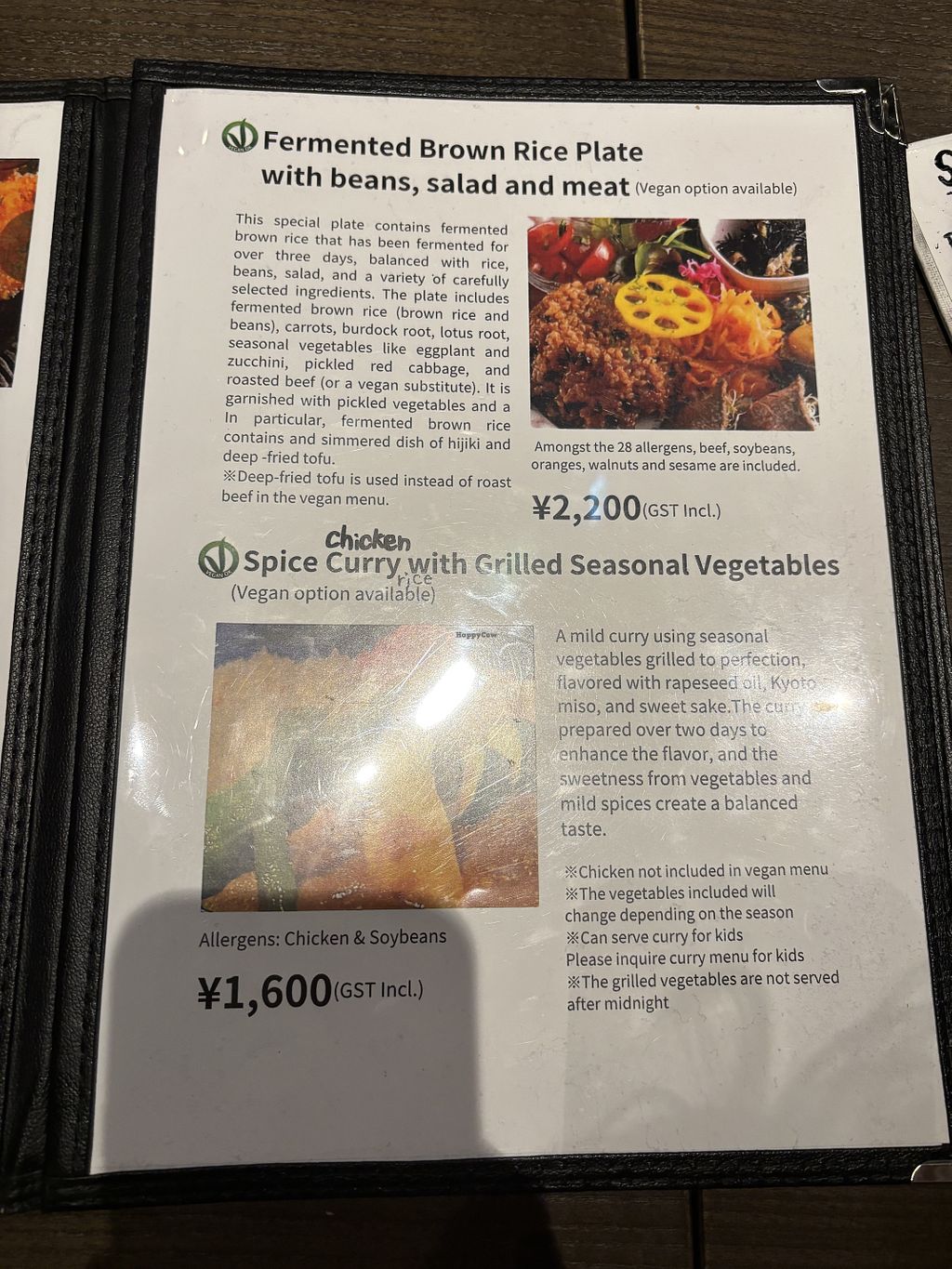 They're a gluten-free restaurant first and foremost, so most of their menu has animal products. However, four or five of their dishes have vegan options, making this good for omni groups. I got the curry, and it was very flavorful. Maybe slightly smaller—and more expensive, at ¥1500—than, say, CoCo Ichibanya. I also got the lycheemoni cocktail, which wasn't terribly strong but good for a weeknight drink.