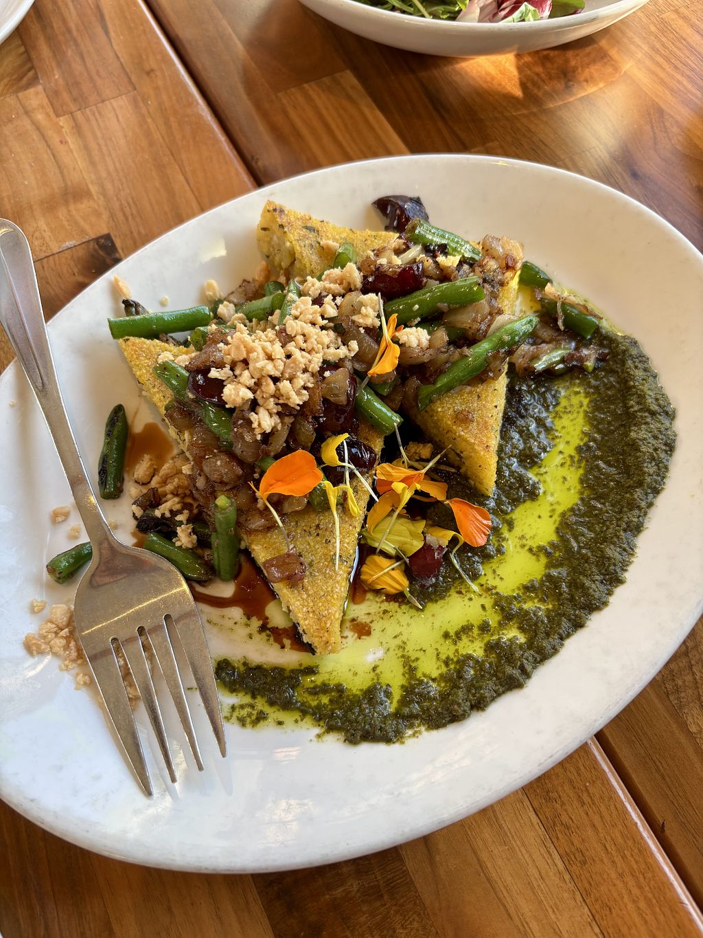Gorgeous restaurant and patio with equally beautiful food. Everything tasted fresh and bright, with local, seasonal ingredients and nice presentation. Unique flavour combinations that really complimented each other. My favourite was the polenta with cherries and pesto but everything we tried was excellent. Almost everything on the menu can be veganized and the entrees work well for sharing. Don’t skip dessert!