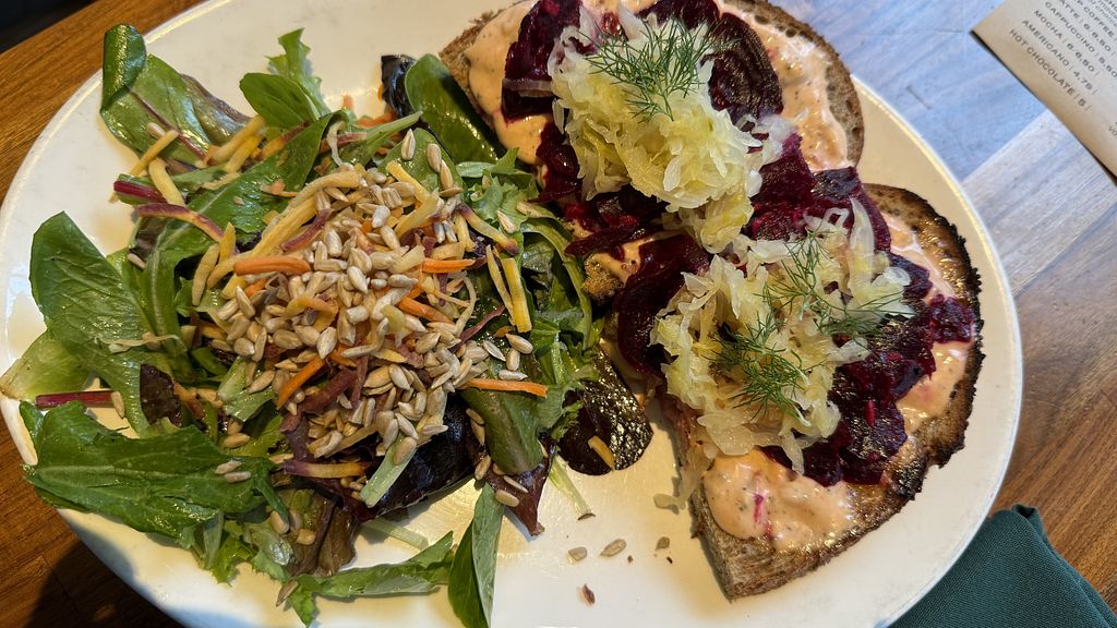 Vegetarian food most can be made vegan. Very friendly people and light and airy setting. Loved the tomato avocado toast and rosemary lemonade and cinnamon roll. Second time here was disappointing: Biscuits and gravy were pretty plain and the tofu on the side way too salty. The Colorado rancho scramble with tofu had cardboard like tasting potatoes and same salty tofu and it was just topped with beans and tortilla chips. It’s not what I call yummy vegan food. Also too pricey.