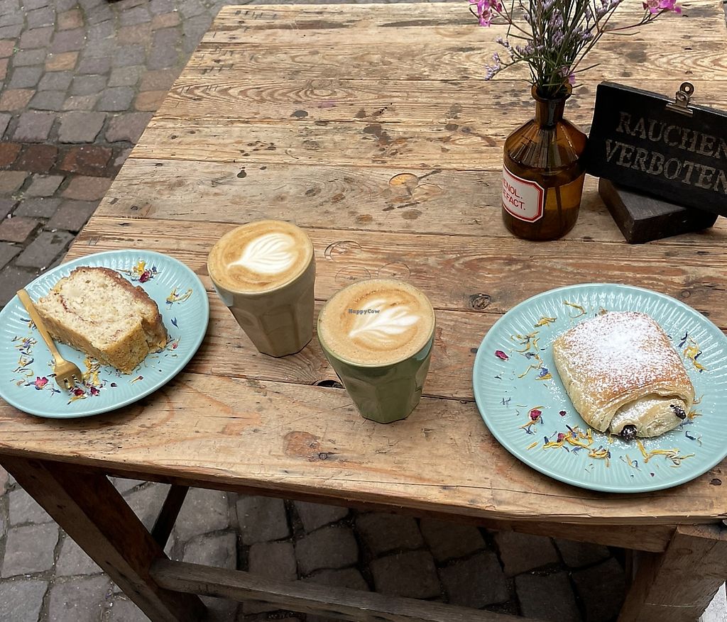 Wir waren sehr positiv überrascht, wie gemütlich es in dem kleinen Hinterhof ist. Der Cappuccino mit Hafermilch war ausgezeichnet und es gab eine Handvoll Auswahl an leckerem veganen Gebäck und Kuchen.