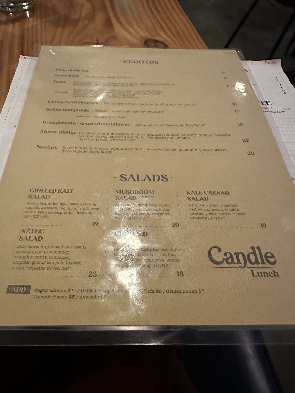 I loved Candle Cafe and Candle 79 back in the day, and this Candle follows the tradition of veggie-forward, perfectly seasoned vegan food. The artichoke appetizer, Moroccan spiced chickpea cakes, cauliflower pizza, and pumpkin pie (on special) were all delectable, as was the Pinot Grigio I tried!