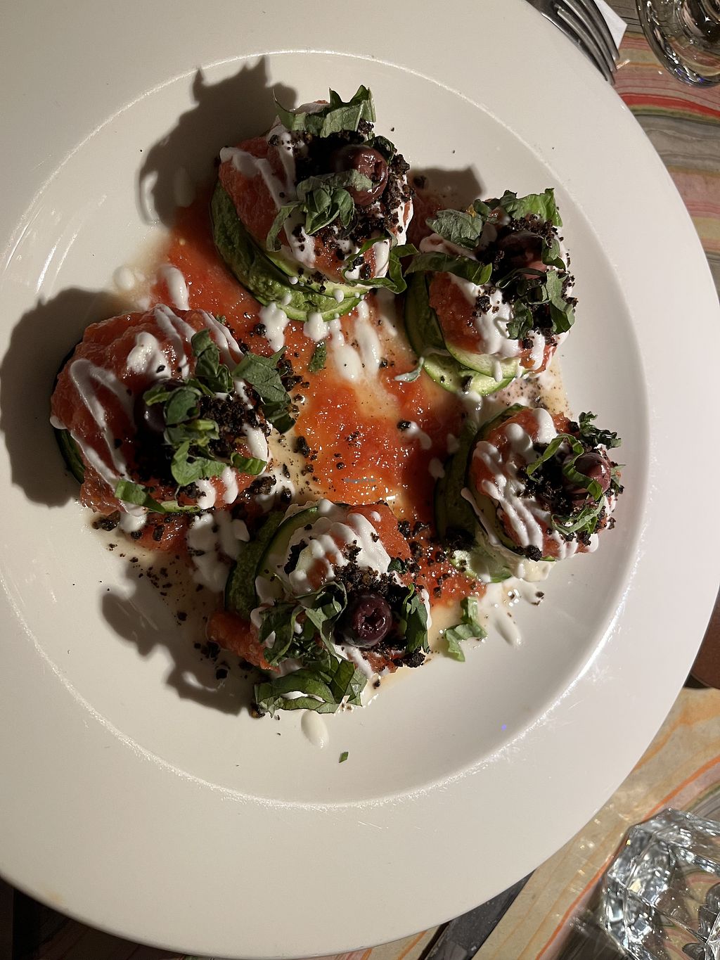 Loved the old school vegan vibe. Very cool environment and I loved the live band. The after dinner herbal tea was delicious. I got the caravan tapas as my appetizer which was a great way to sample all the dips, so good with the raw bread! I got the raw nori rolls as my entree because I wanted a small portion and this is what they recommended, good flavors. The mango and coconut pie was delicious, so light and airy!