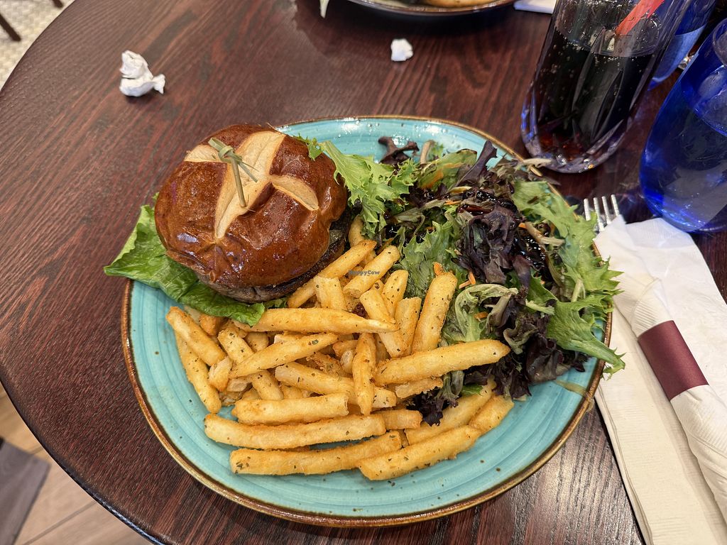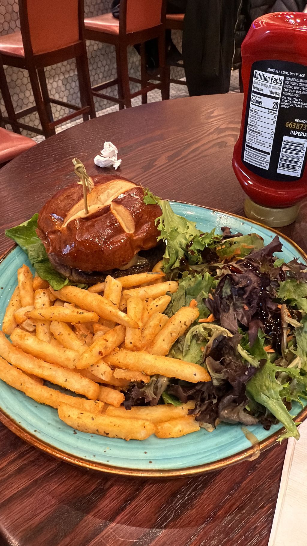 My vegan impossible burger was so divine. I was worried that the caramelised onions would be too sweet but they were actually great! The rosemary fries were a nice surprise and the dressing on the salad was delicious.