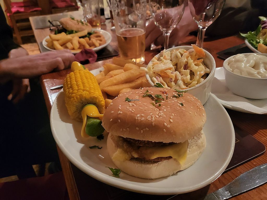 Down in Eastbourne for a weekend and wondering around looking for dinner. What a surprise to see a full vegan menu in this 40 year old Eastbourne institution. The owner's daughter went vegan 4 years ago and introduced this surprising and delicious vegan diner menu. Started with garlic bread with cheese, which was massive and tasty. Main was a cheese and pineapple burger which to my surprise came with a double patty, onion rings and chunky chips. Made the optimistic mistake of ordering cheese chips too. Had to take away a doggie bag.