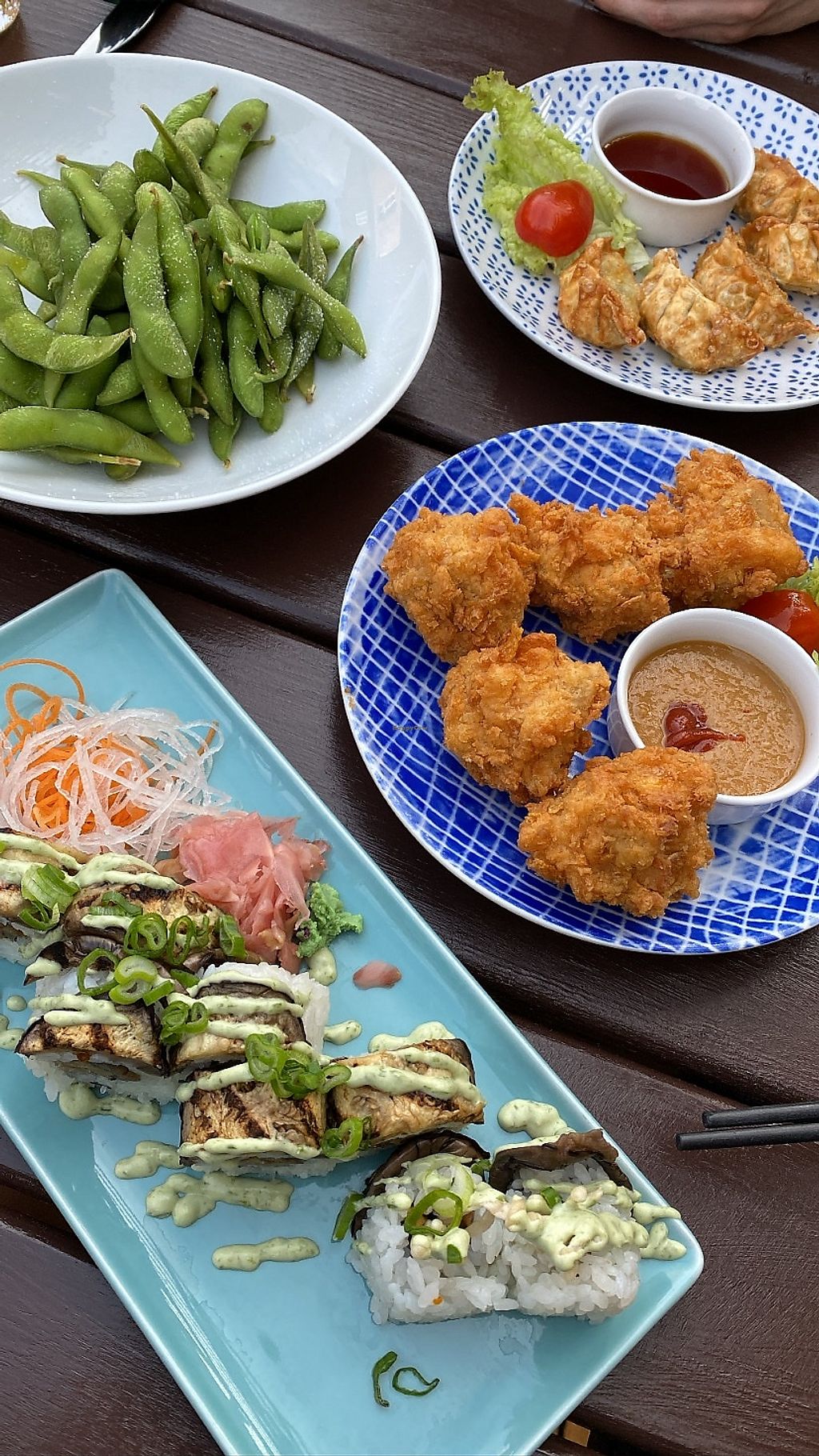 Great selection of dishes, and our meat-eating friends seemed to enjoy their dishes. Lovely outdoor seating area! Lots of sushi options! A little outside the city center, but we were in the area and were not disappointed!