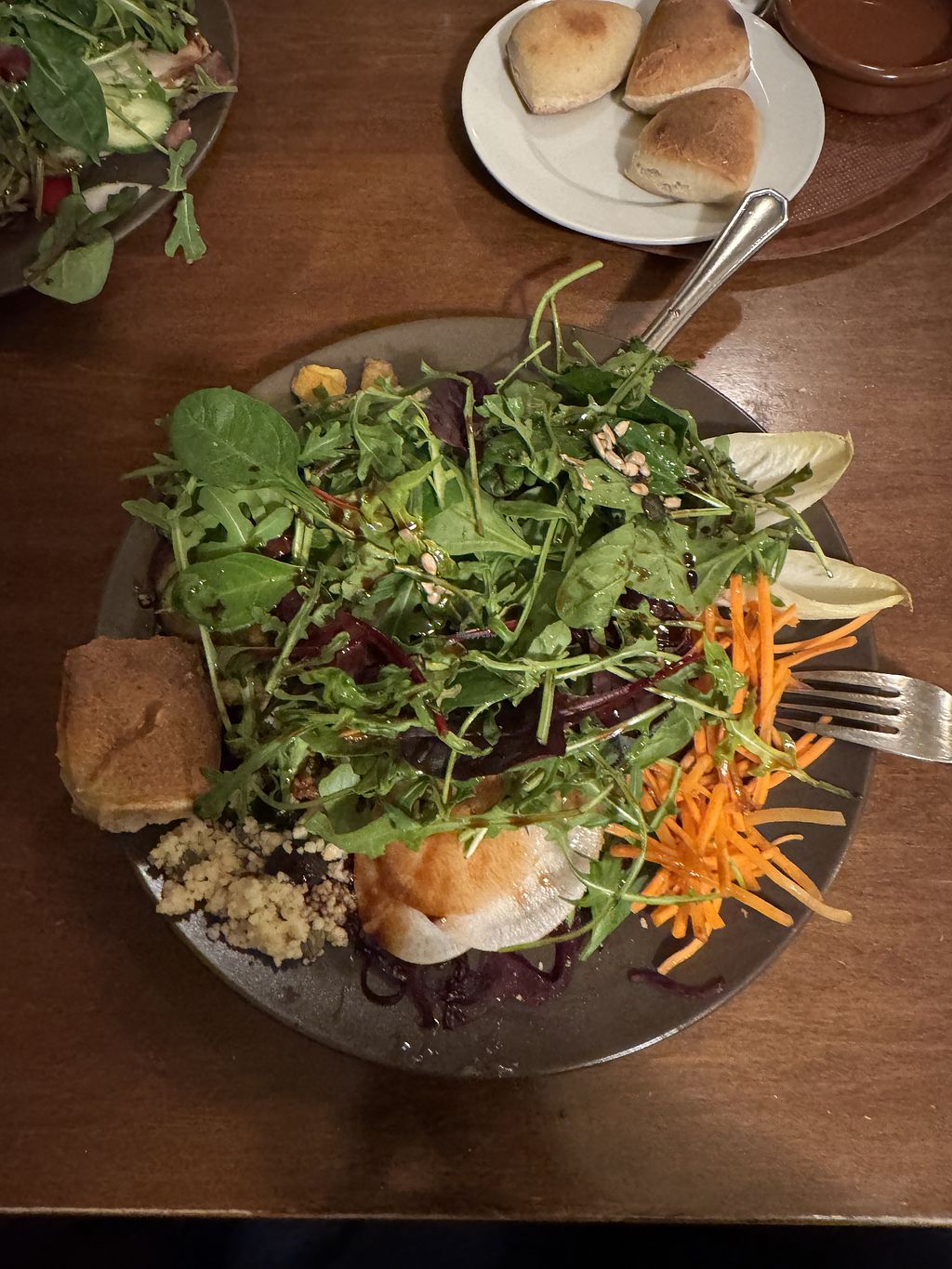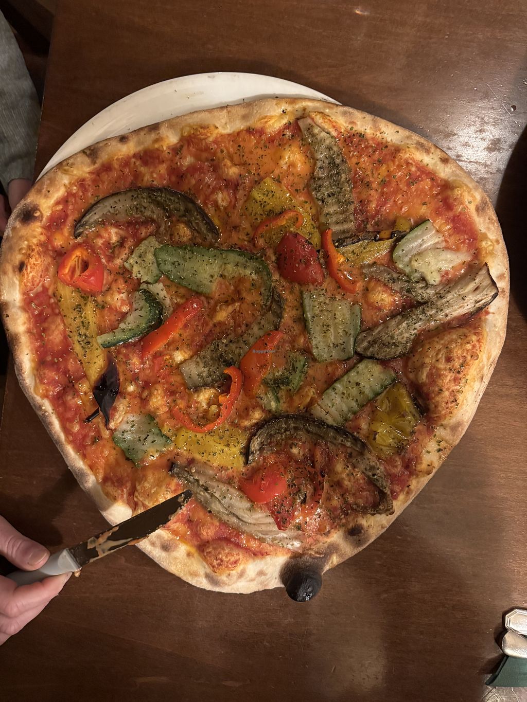 Wir haben den riesigen gemischten Salat, die vegane Lasagne und eine vegane Pizza gegessen.