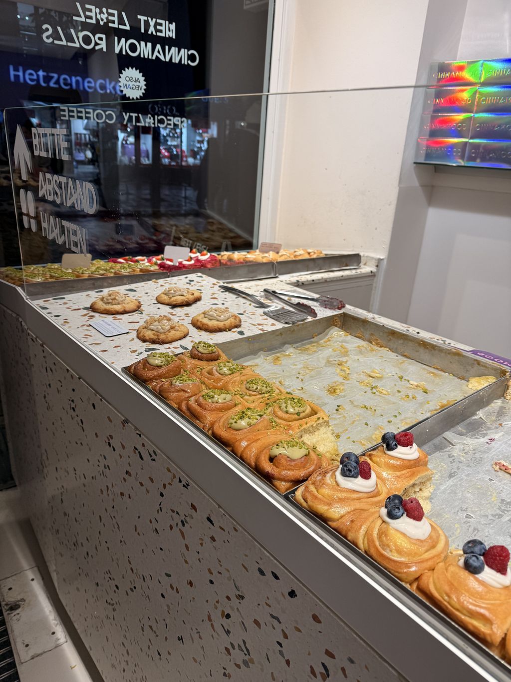 Almost half of the cinnamon rolls here are vegan (raspberry, Bueno, Speculas, plum crumble and poppy seeds, āBienenstichā), but sadly these come with surcharge. They are a bit small but fluffy and tasty. Probably overpriced as it is the new hype in town. Only take-away in boxes, no sitting area. Prepare for a long waiting time in the queue outside!