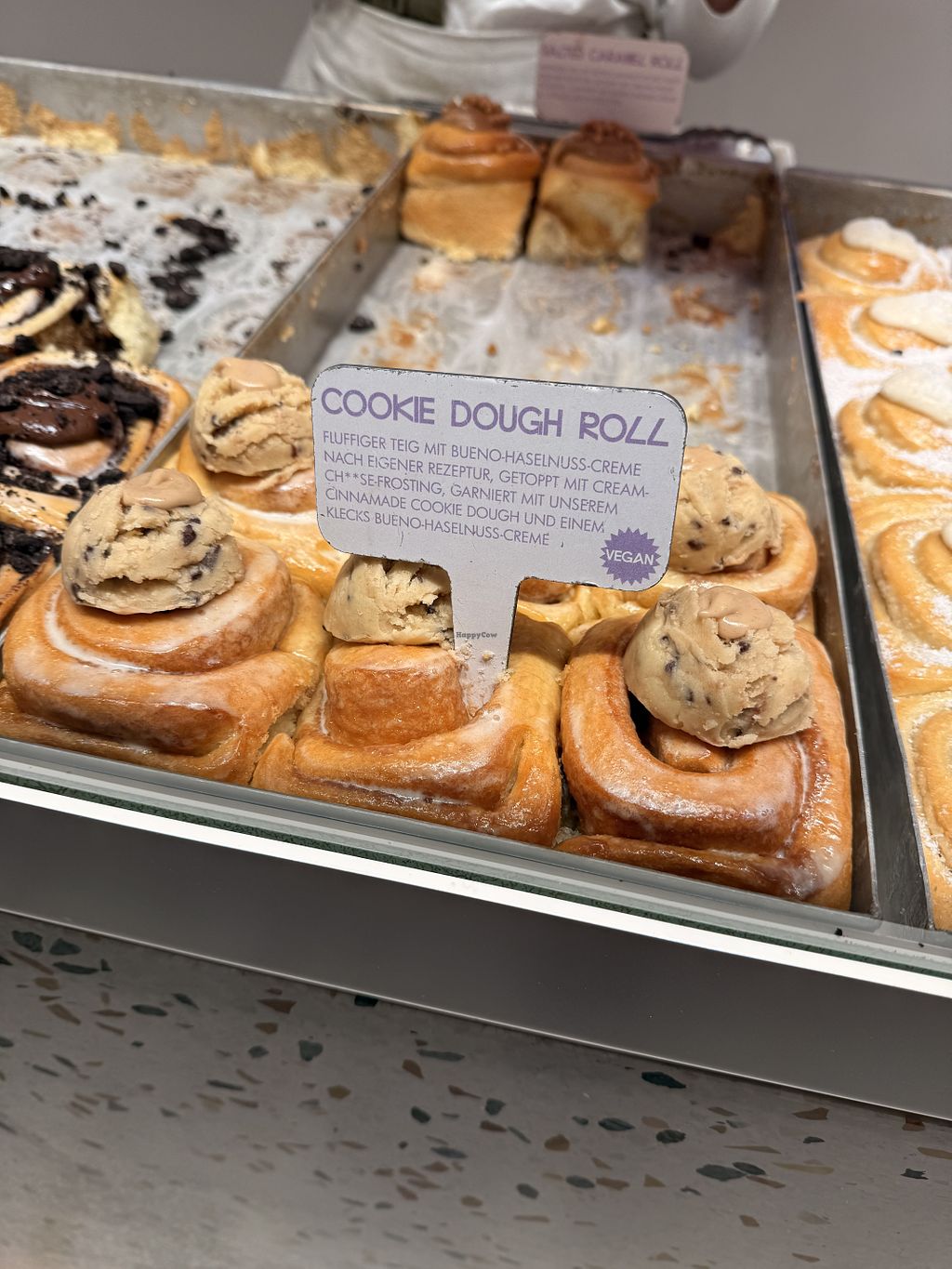 Gooey and warm. More than 70% of the rolls were vegan. Very tasty.