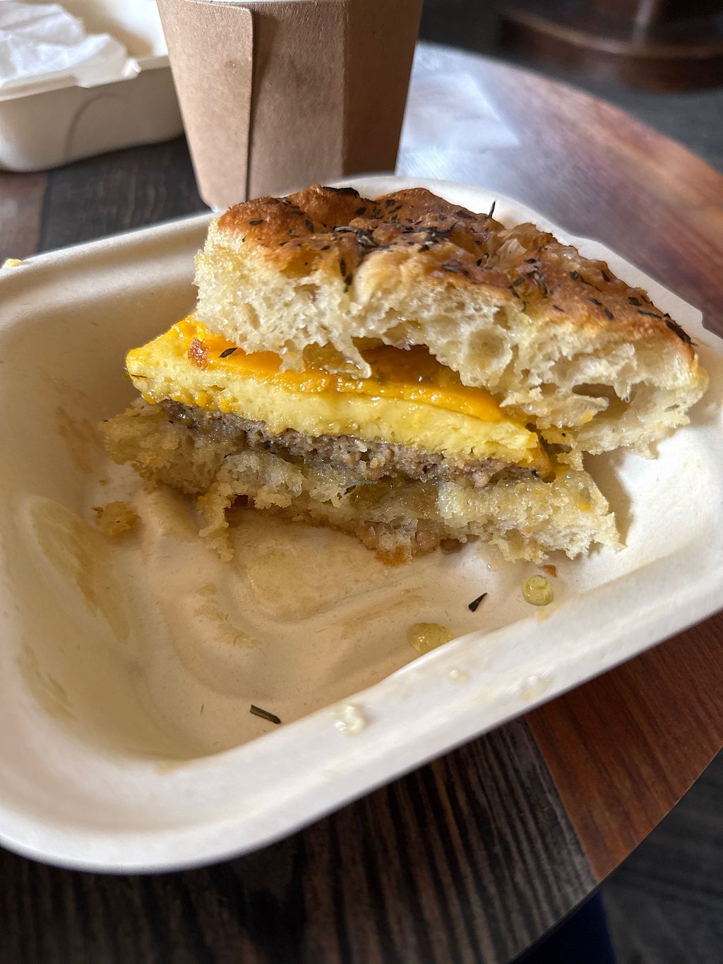 I ordered the vegan breakfast sandwich which is egg, cheese, sausage (all vegan), and pepper jelly on focaccia. Very filling—saving half for later. They also had a vegan donut, cookie, and muffin top.