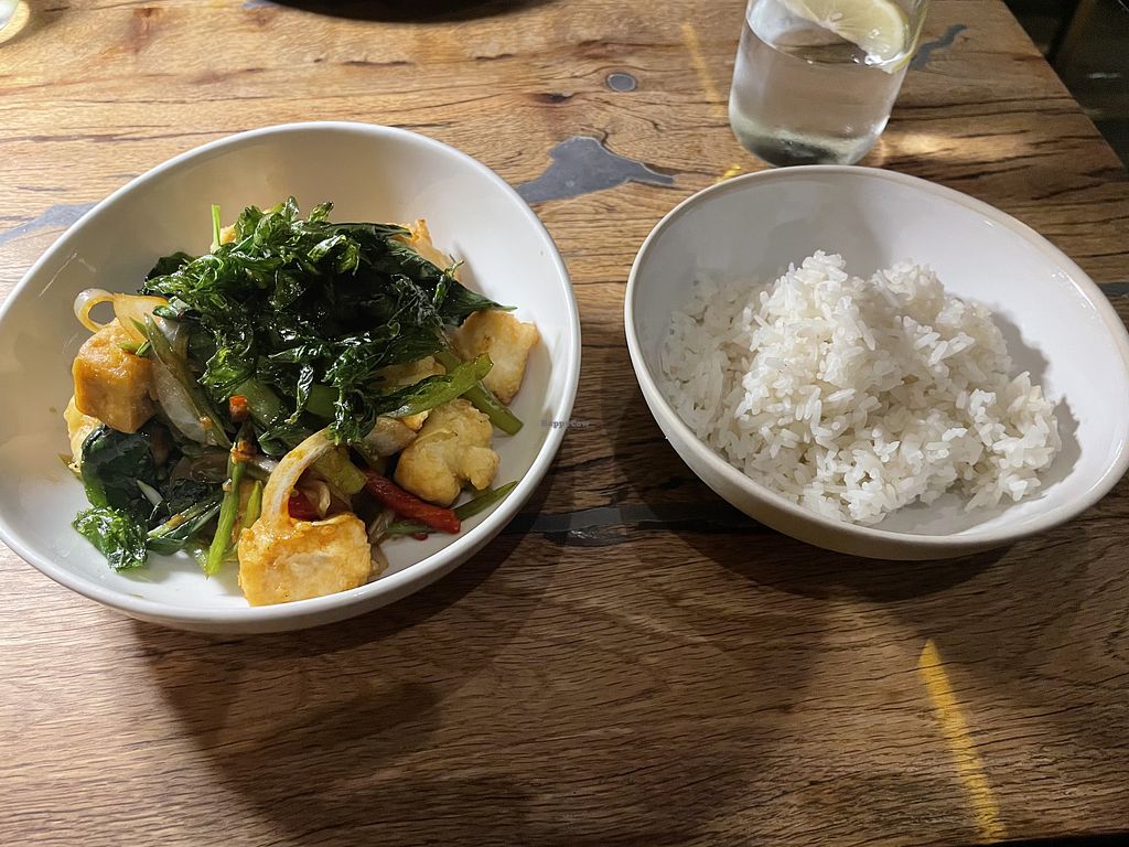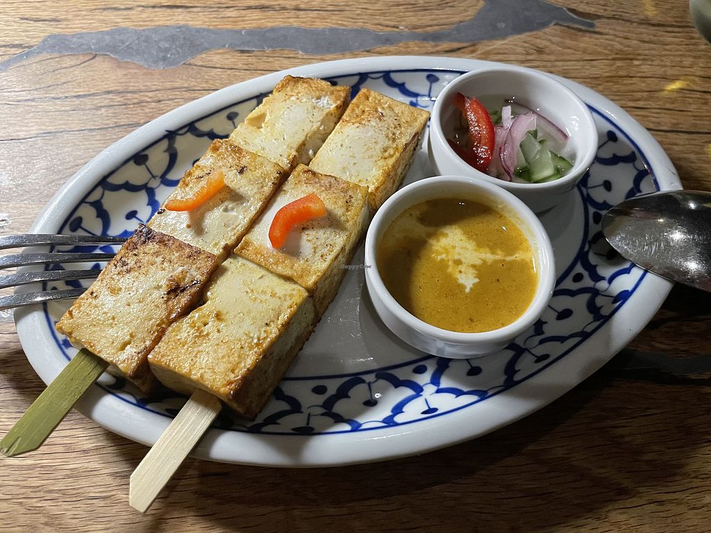 Serves meat, vegan options available. Thai restaurant with vegan choices. Separate vegetarian includes vegan kao pad sapparod (pineapple fried rice), garlic roasted tofu, rice paper rolls, grilled tofu satay with peanut sauce, Thai curry and more. Open Mon-Sun 12:00pm-11:00pm.