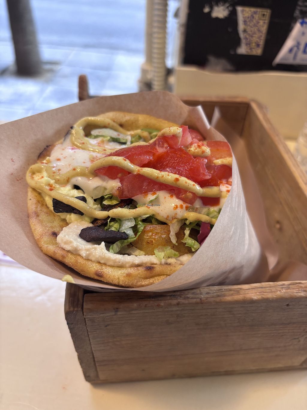 We came to this area on purpose for this food. It did not disappoint! Amazing mushroom souvlaki with so many different choices of toppings and sauces. Excellent value here including the wine!!