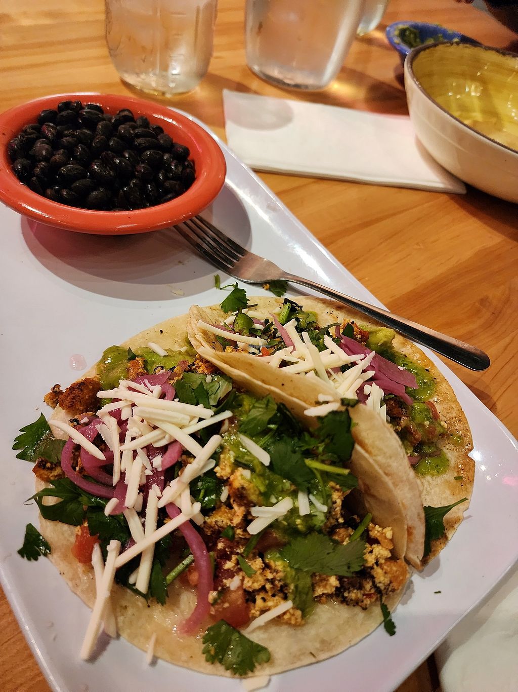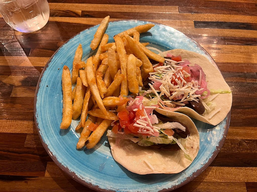I had the vegan beef tacos ‘mericanized and authentic with a side of black beans. The vegan beef was not the “ground” style I was expecting and more so like a steak style. Nonetheless, they were delicious tacos probably made better due to the salsa roja and verde. Service was excellent and the food came out quickly. Would go back and try other menu items