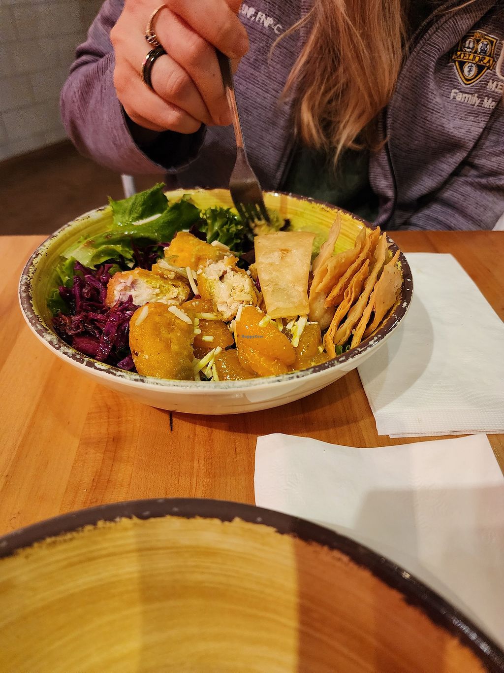 Vegan fish, vegan beef tips, vegan queso, vegan fried chicken protein options for most menu items. Vegan nachos are really tasty and filling