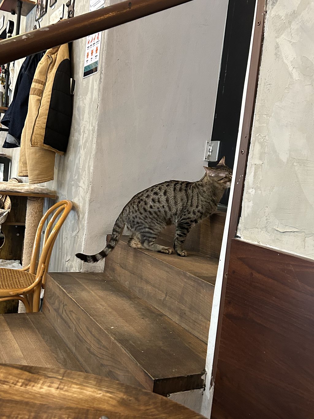 La atmósfera es muy especial: luces bajas como un bar pero sirven comida y también es un refugio de gatos rescatados que están a sus anchas en el espacio. Toda la decoración está dedicada a los gatos pero es una pena que sirvan productos de origen animal.