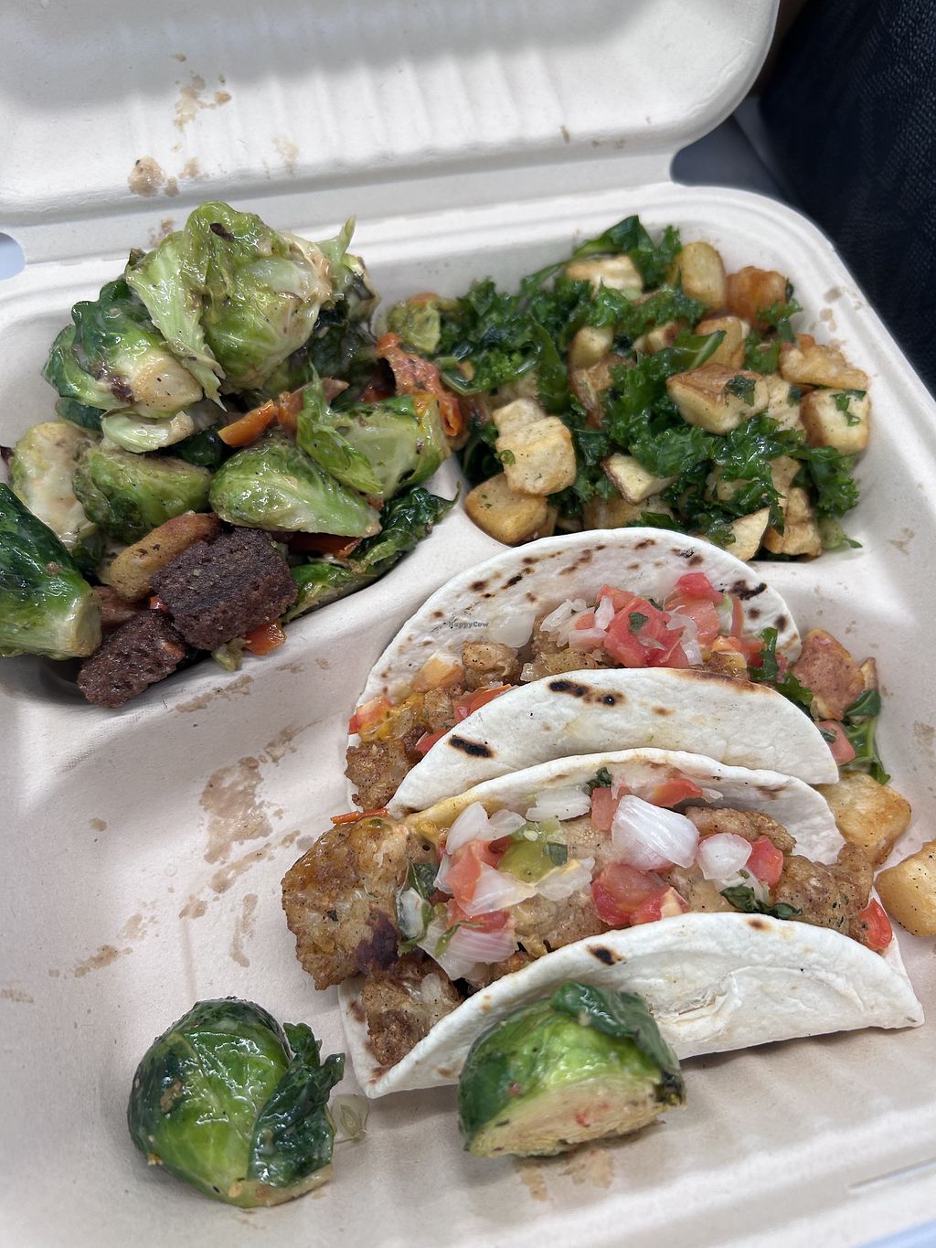 They have several vegan options but they’re bad and expensive and the same prices as meat. We grab a 2 taco and 2 sides combo for $20 and a single taco for $7. They have cauliflower fried tacos. Brussels sprouts salad and fries with kale. Also saw that they have a cold southwest vegan cauliflower burrito. Food seemed greasy