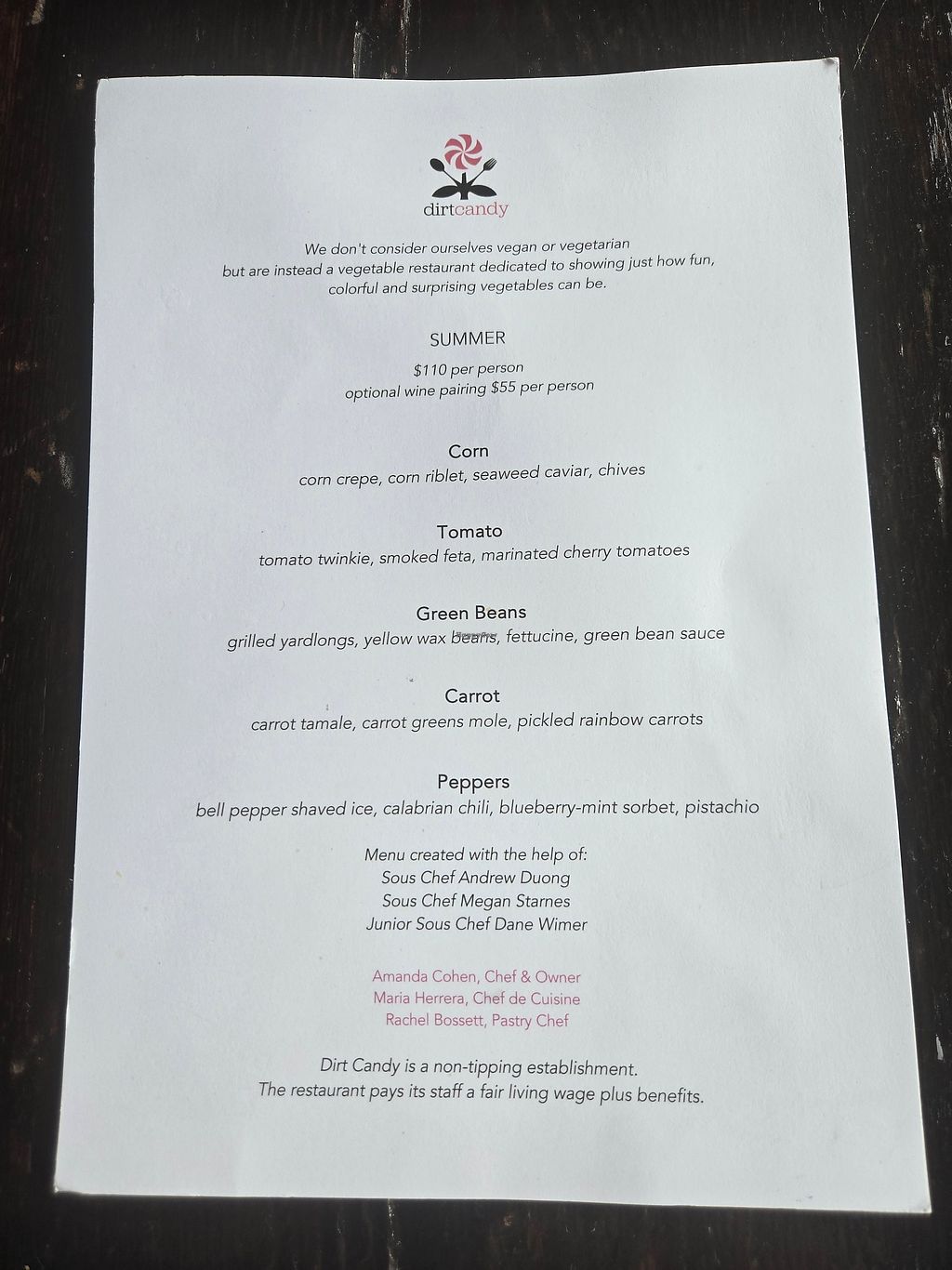 My photos are from 2018, menu is ever changing. Our experience was fantastic. delicious and beautifully prepared meals, great wine pairing. You can see everything being prepared with an open kitchen in the center of the dining room. A bit pricy, but its worth the experience at least once! If price is a concern, for less money there are other fantastic vegan restaurants in NYC too! I would love to go back. Recommend booking far in advance.
