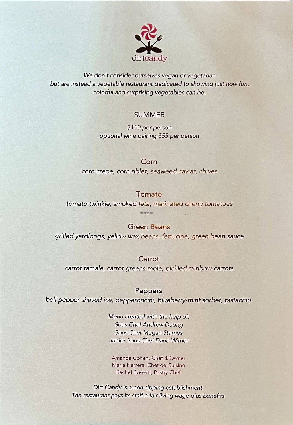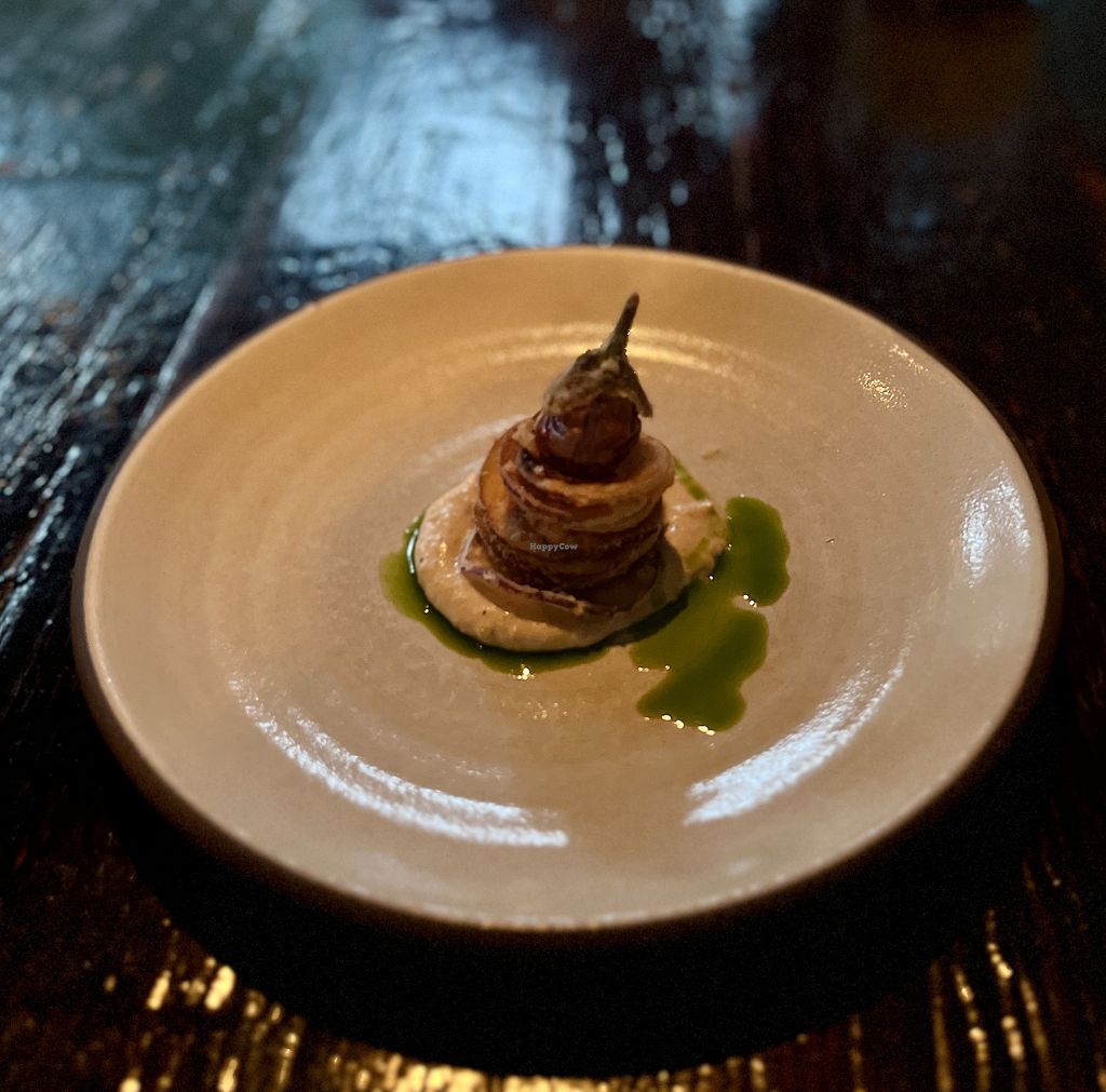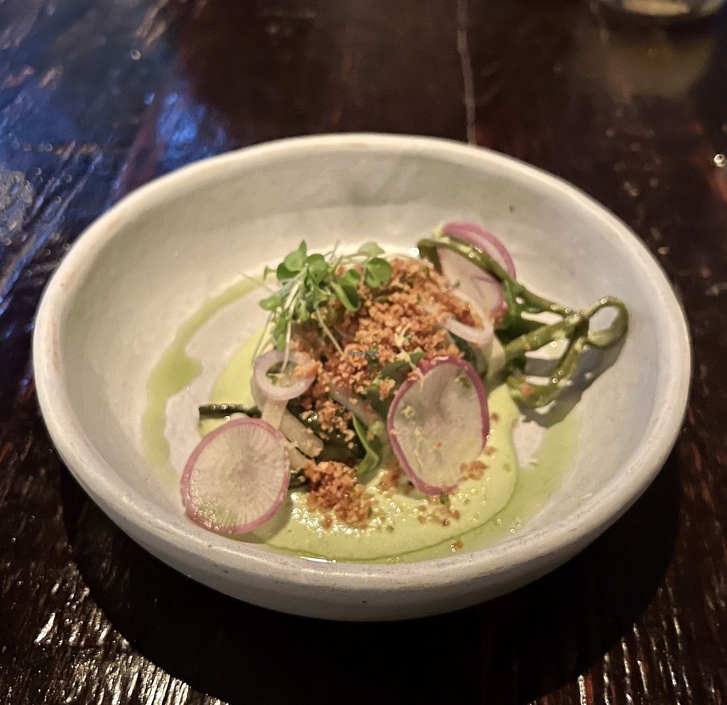 We had the 10-course “Vegetable Garden” option with the wine pairing. Restaurant is all vegetarian- just let them know when you make a reservation that you’re vegan and they can make vegan versions of everything. The food was delicious, inventive, and whimsical with a variety of flavors and beautiful presentations highlighting different vegetables. One of the best and most inspiring restaurant meals I’ve had in a while! The wine pairing featured wines made by women, which I thought was awesome. It’s expensive, but worth it for a special occasion!