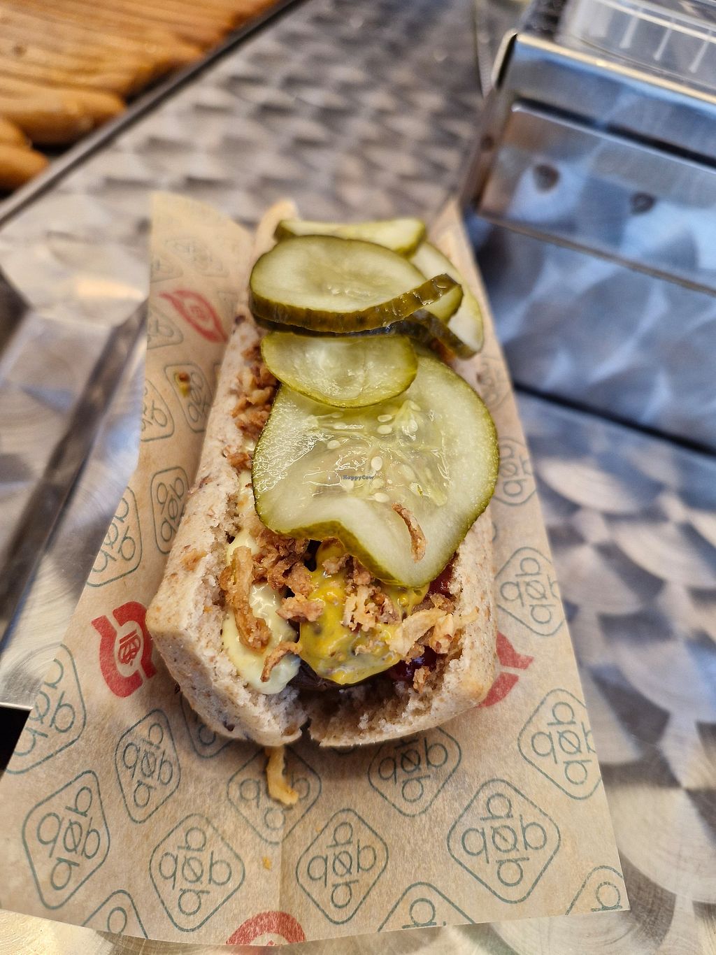 I got the vegan hot dog with all the vegan toppings. I enjoyed the hot dog. The pickles are sweet pickles if you are a dill over sweet pickles eater.