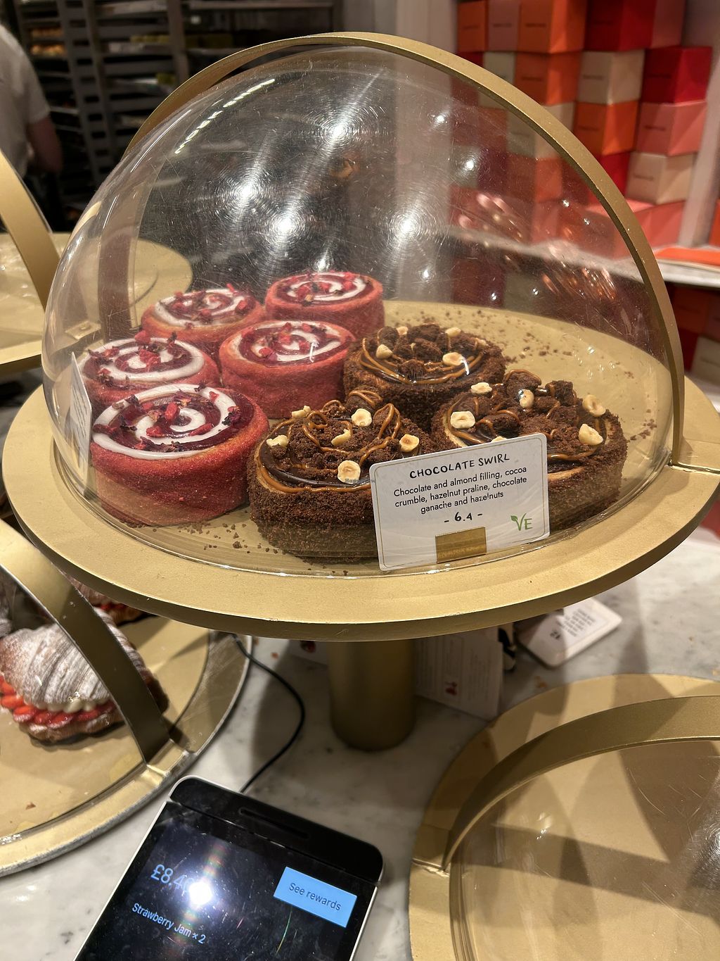 Donutelier looks very fancy from the outside, and since it was quite busy, I got curious and decided to check it out. At first, I thought there were no vegan options at all, but at the very end of the counter I finally spotted two: a chocolate swirl and a raspberry marzipan swirl. Both looked beautiful.