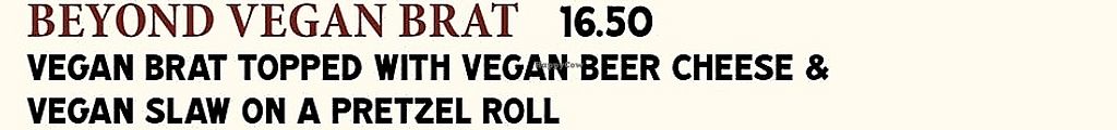 Serves meat, vegan options available. Brewery with a few dedicated vegan choices which may include the Beyond Meat vegan brat (with vegan cheese & vegan slaw), cauliflower wings (confirmed vegan) and fries. Also has Kettle chips. Open Mon-Sun 6:00am-9:00pm.