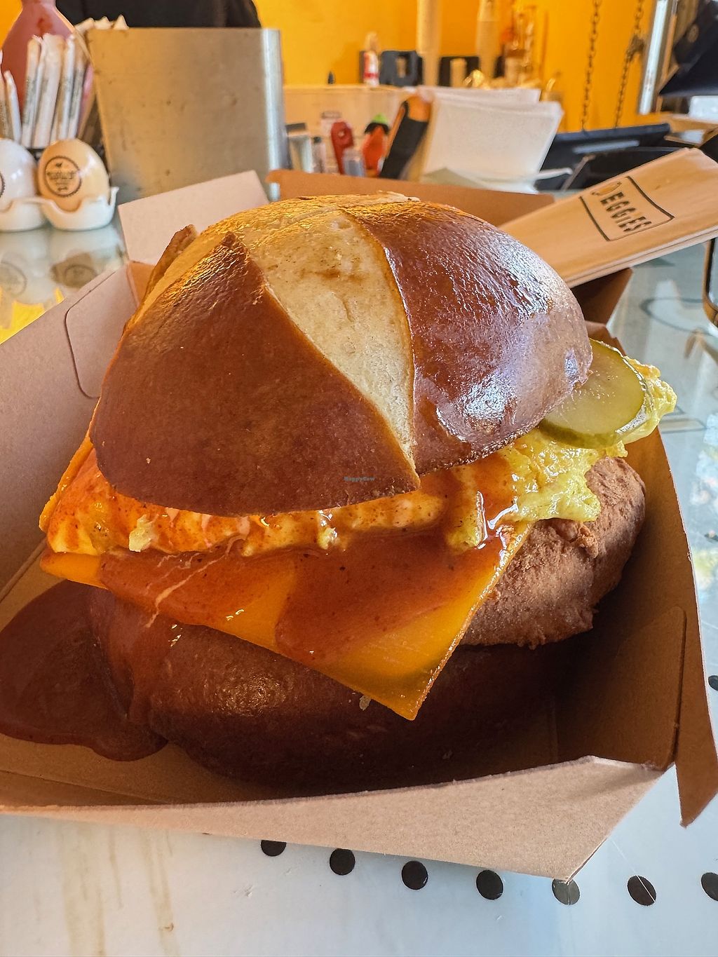 Great breakfast sandwich if you're feeling junky. Fried chick'n could have been more tender. Good vegan cheddar cheese (though could've melted better) and just egg and sauce. Not a huge fan of the pretzel bun – too much bread.