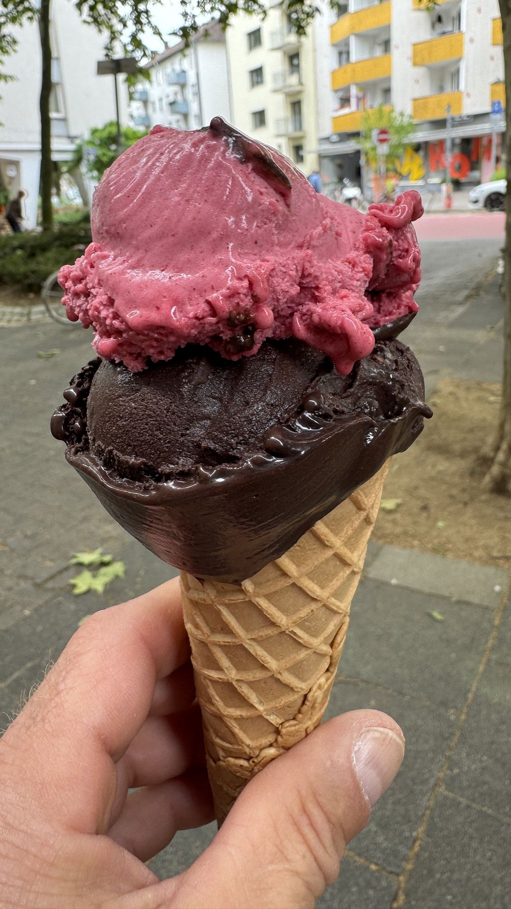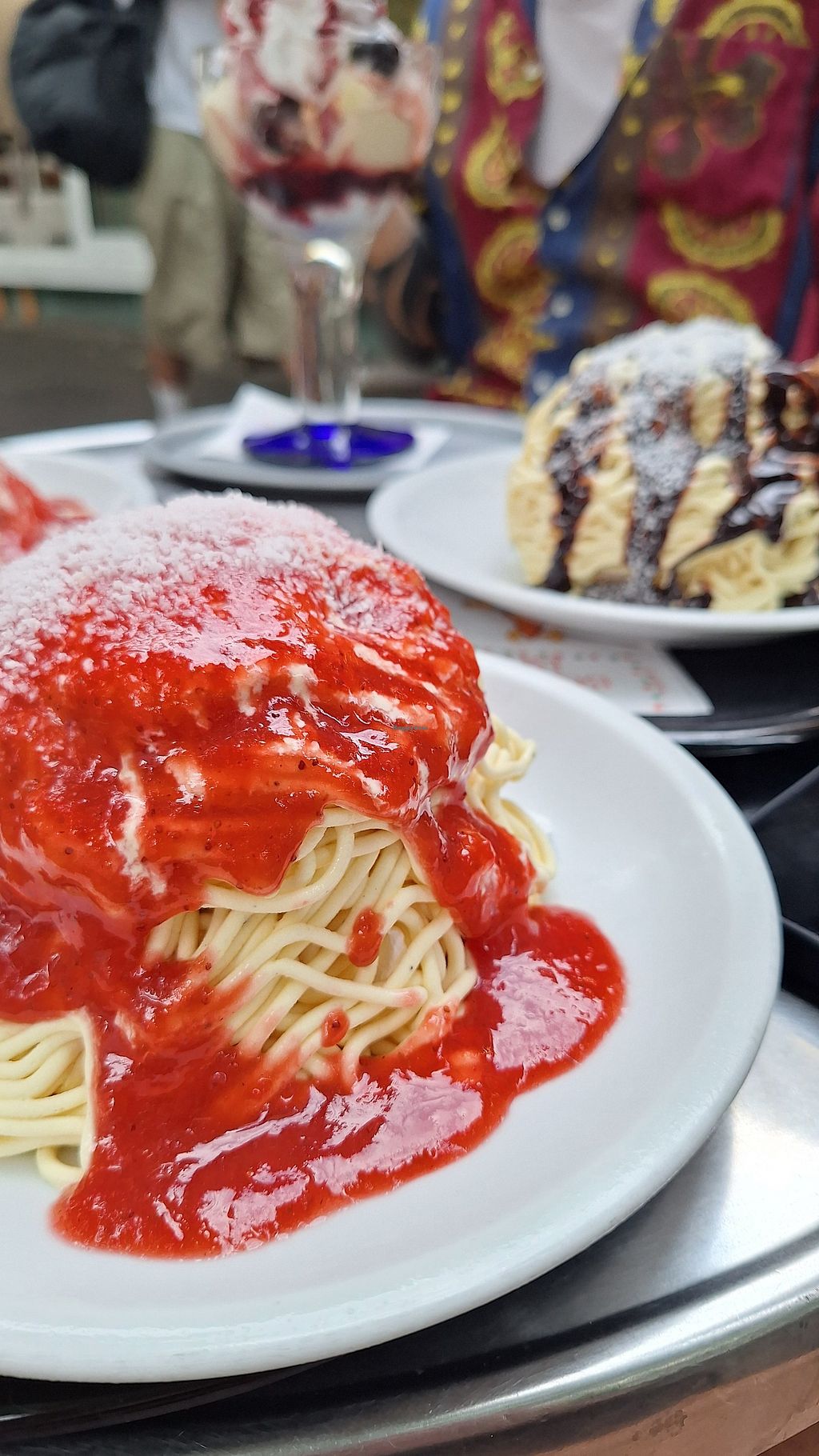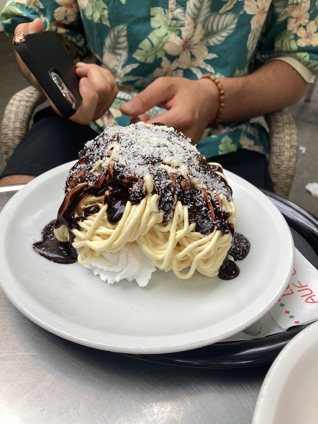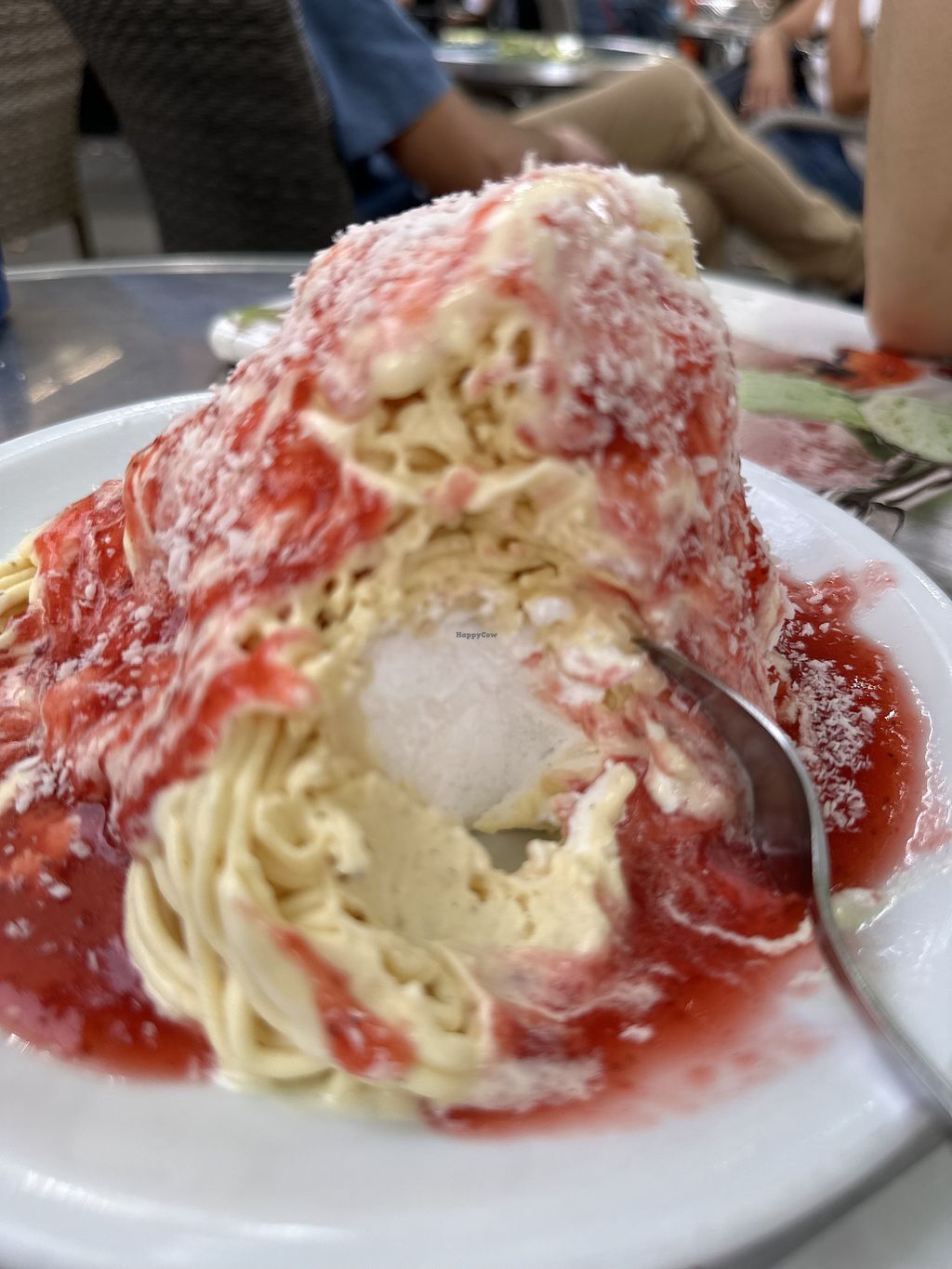 Yummy eis, comes with cream, strawberry sauce and coconut flakes